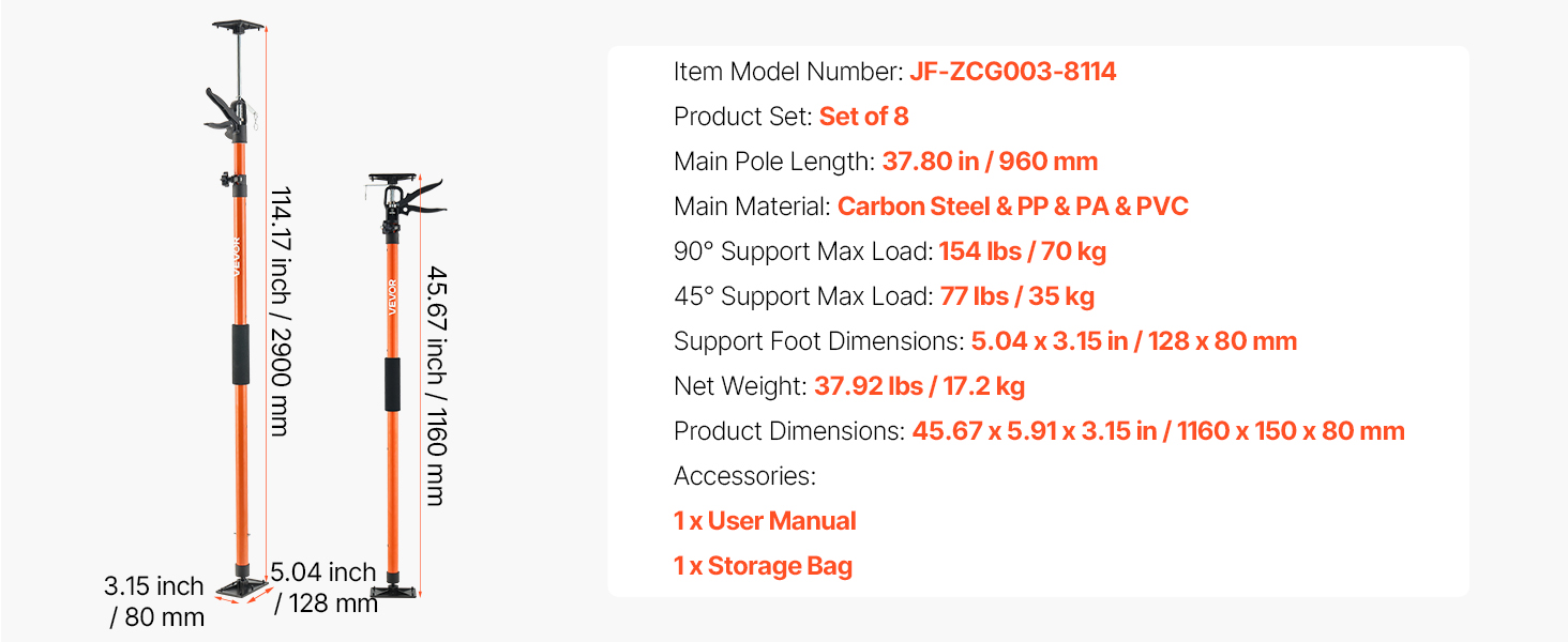 Táto súprava 8 ks podperných tyčí pre skrinkové zdviháky poskytuje účinnú podporu nákladu na stavbách, v skladoch a pri domácich projektoch. S nosnosťou 154 libier, nastaviteľnou výškou a bezpečným uzamykateľným dizajnom je ideálna na zdvíhanie alebo pridržiavanie skríň, sadrokartónových dosiek a ďalších predmetov.