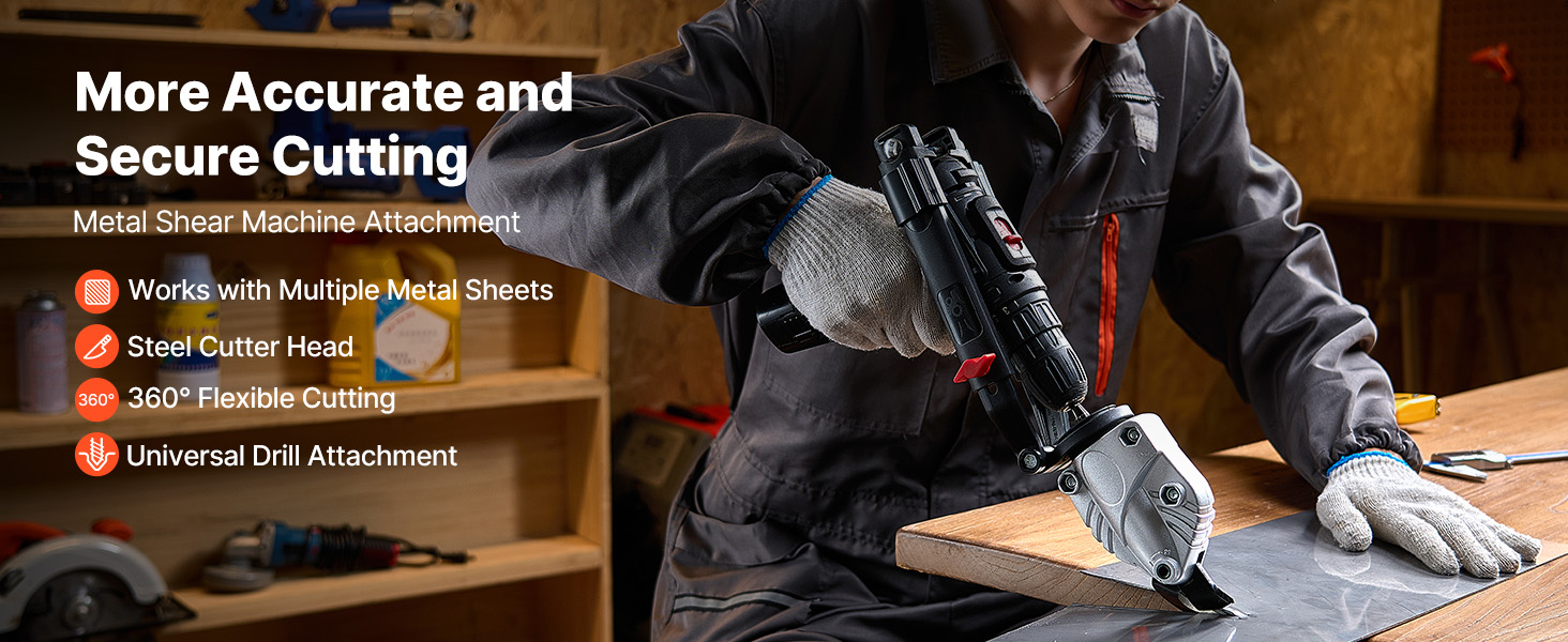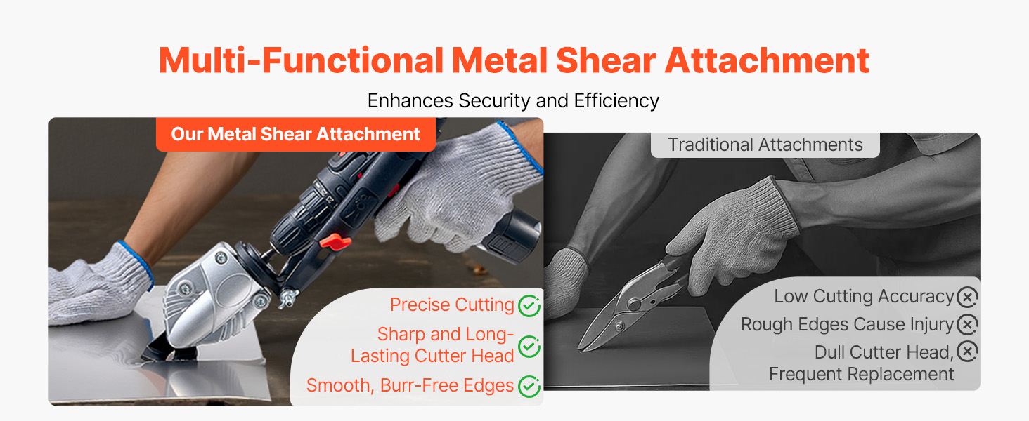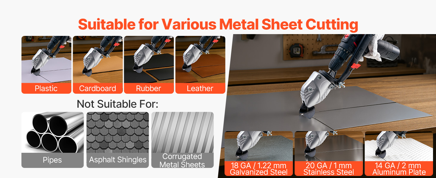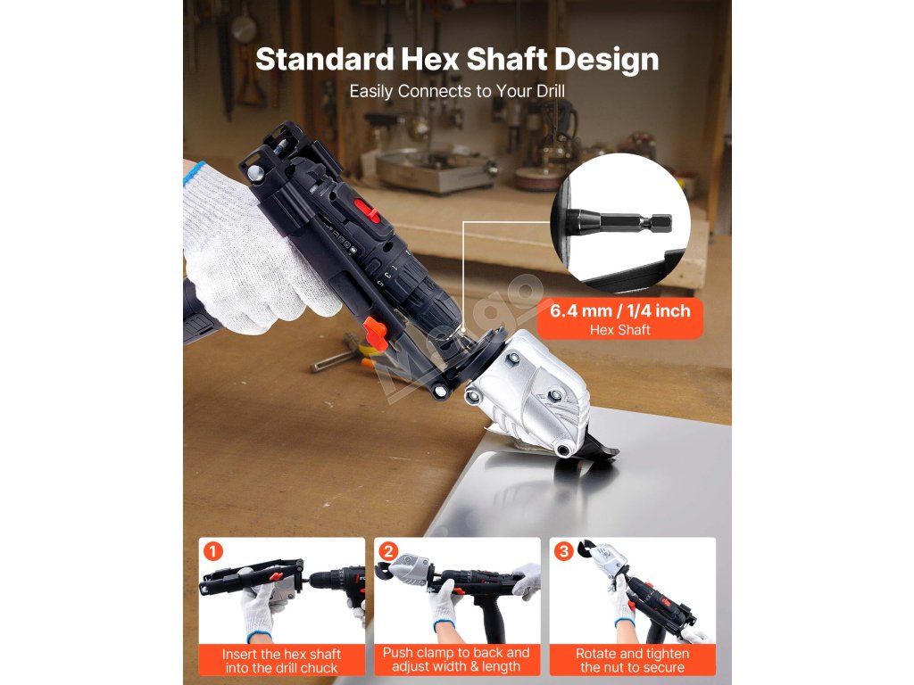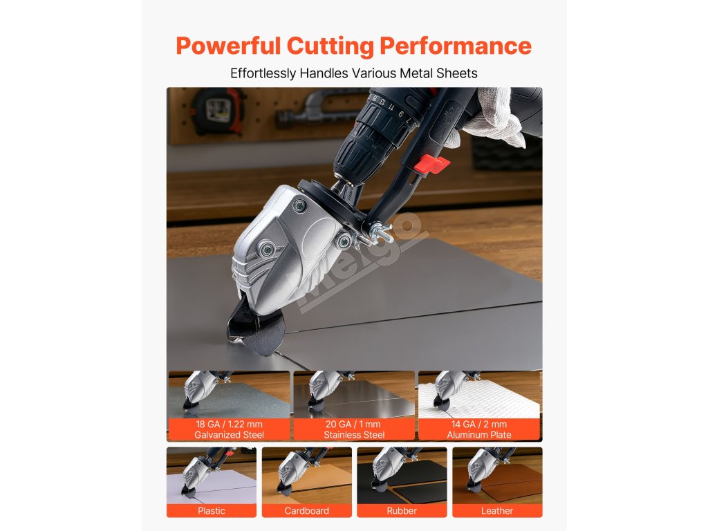 Tento vŕtací nožnicový adaptér strihá viac ako kovy - nerezovú oceľ, pozinkovanú oceľ, hliník, plast, kartón, gumu a kožu. Poskytuje čisté a efektívne výsledky. Nie je určený na rezanie rúr, asfaltových šindľov alebo vlnitého kovu.