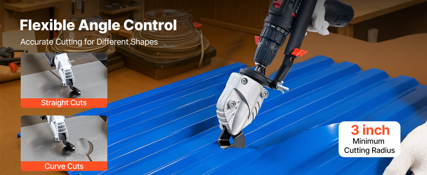 Tento nástavec na štiepanie plechu ľahko reže nehrdzavejúcu oceľ, pozinkovanú oceľ a hliník. Kalené čepele a 360° otočná hlava zabezpečujú presnosť, zatiaľ čo univerzálna vŕtacia stopka sa rýchlo pripája k väčšine vŕtačiek na rýchle a bezproblémové rezanie.