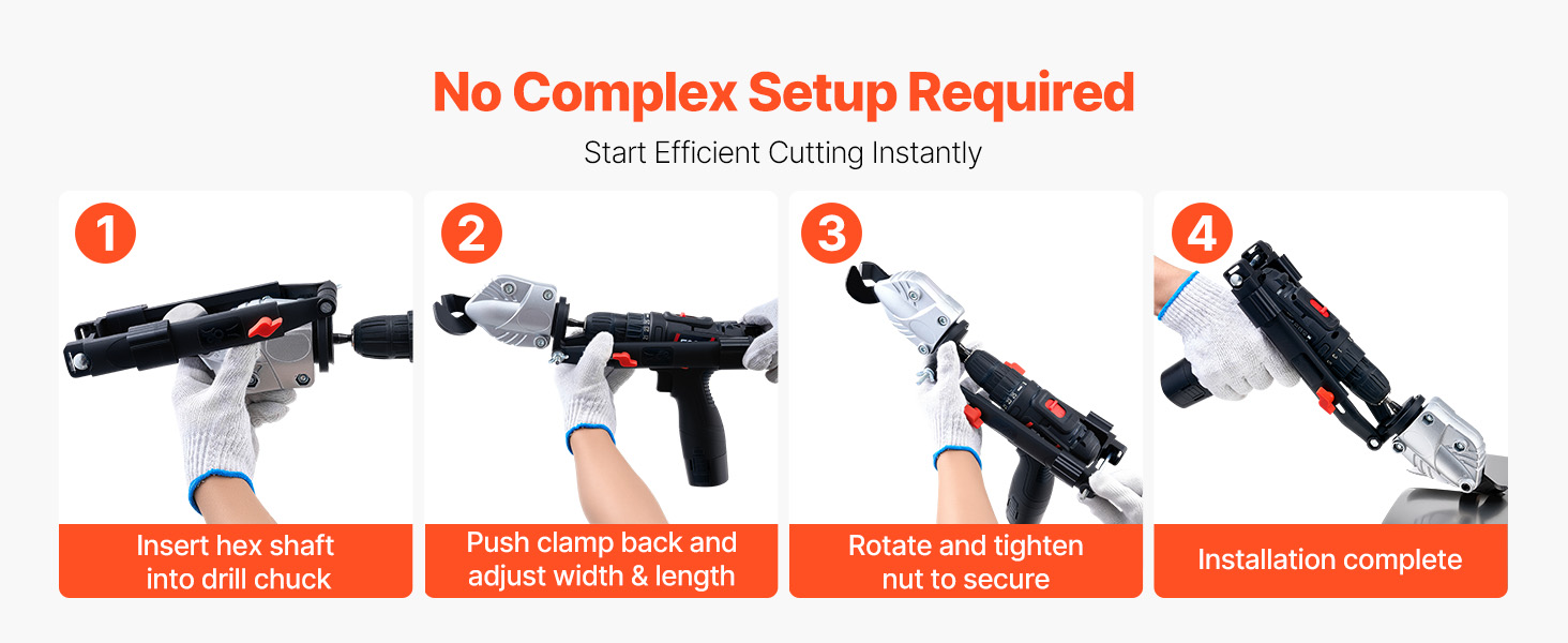 Tento nástavec na rezanie plechu je vybavený šesťhrannou stopkou 1/4 palca na jednoduché ovládanie. Rýchlo sa pripojí k vŕtačke bez zložitého nastavovania, čo vám umožní ihneď začať s rezaním úloh.