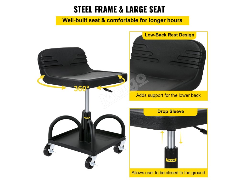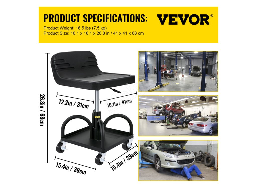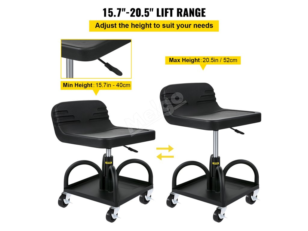 Naša pojazdná garážová stolička je robustná a spoľahlivá. vysoká nosnosť 300 LBS a 16" sedadlo vám umožnia pohodlnú prácu v garáži alebo dielni. Pneumatické sedadlo dokáže nastaviť ideálnu výšku od 15,7 palca / 40 cm do 20,5 palca / 52 cm na projekty. Veľká odkladacia priehradka umožňuje poriadok vo vašom vybavení. Veľké kolieska zabezpečujú vynikajúcu mobilitu a dve brzdy udržia sedadlo počas práce na mieste.