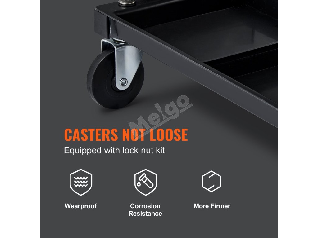 Garážová stolička pre mechanikov VEVOR je robustný nástroj na náročné použitie. Je vybavená zosilneným rúrkovým oceľovým rámom. Tento rám sa ľahko nedeformuje, čo zaručuje odolnosť. Stolička unesie až 250 kg vďaka svojej pevnej konštrukcii. Kolieska sú upevnené pomocou poistných matíc a lepidla na závity. Zabezpečujú, že stolička zostane stabilná aj pri veľkom zaťažení. Je teda ideálna aj na časté a dlhodobé používanie. Tejto stoličke môžete dôverovať pri rôznych úlohách bez obáv o jej stabilitu. Pevná konštrukcia poskytuje roky spoľahlivej opory pre vašu prácu.