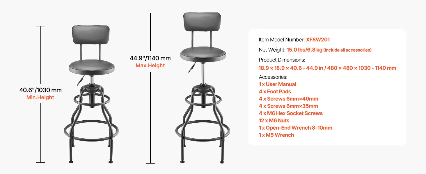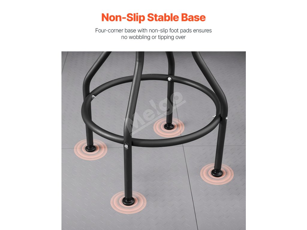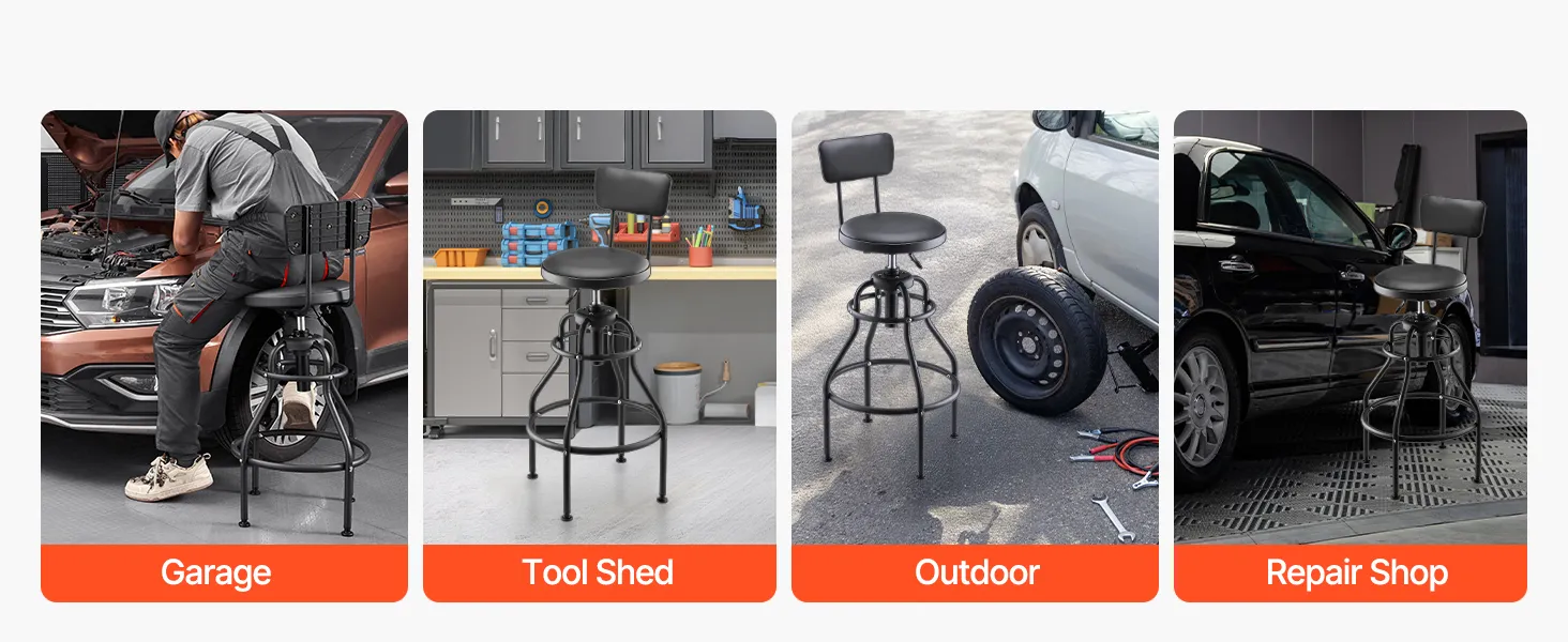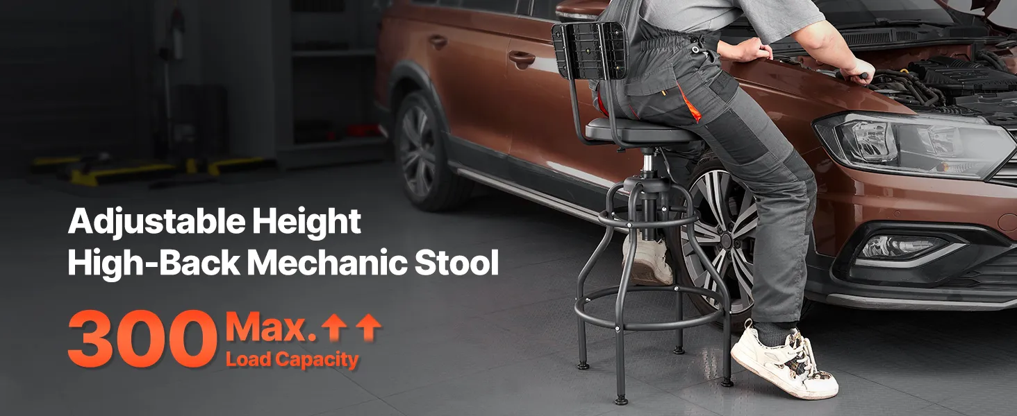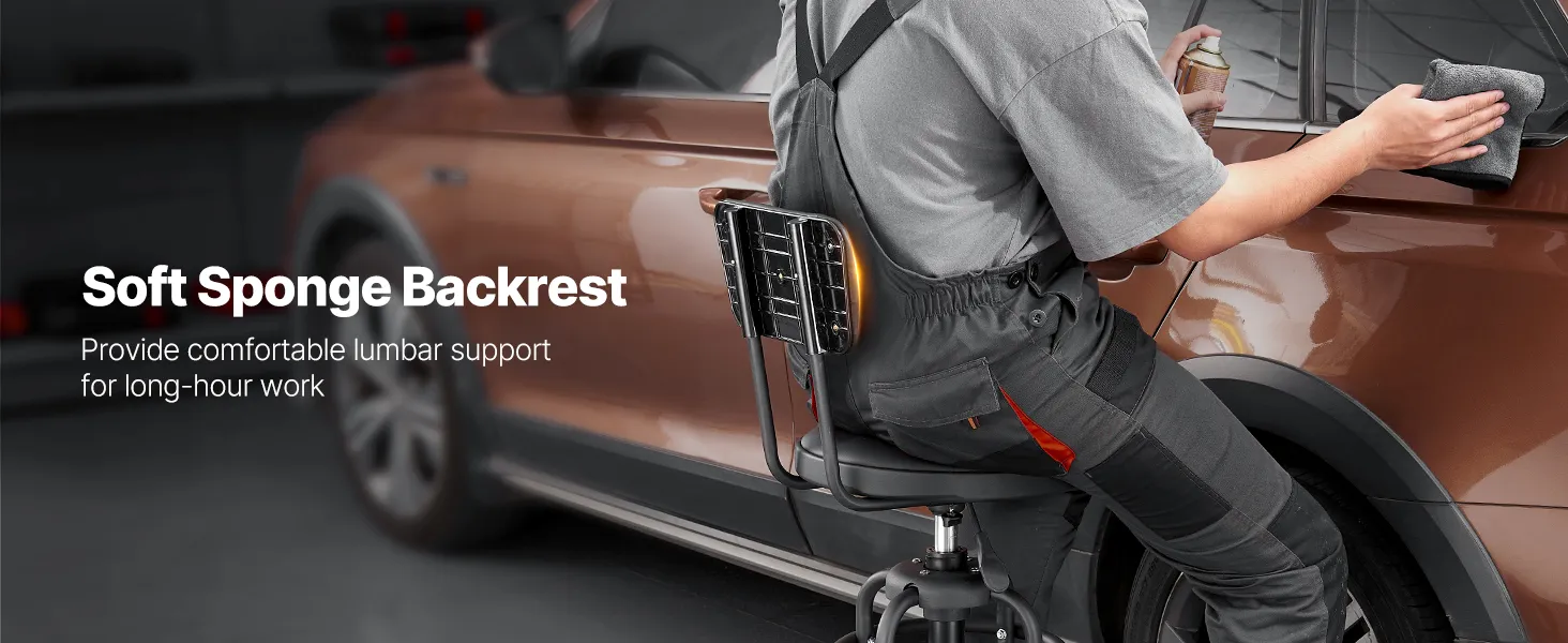 Naše sedadlo na opravu v garáži má odolný oceľový rám a zosilnené skrutky s nosnosťou 300 libier. Ponúka stabilitu, pohodlie a správnu výšku, vďaka čomu môžete pracovať bez dlhého ohýbania alebo kľačania.
