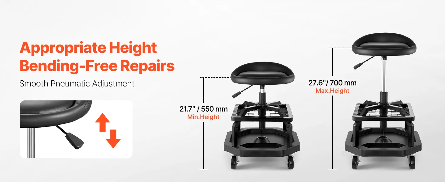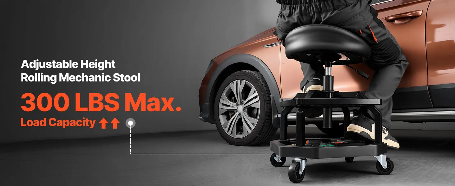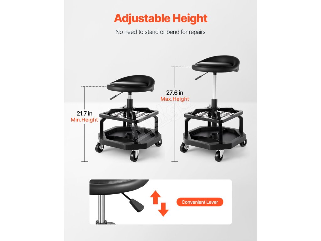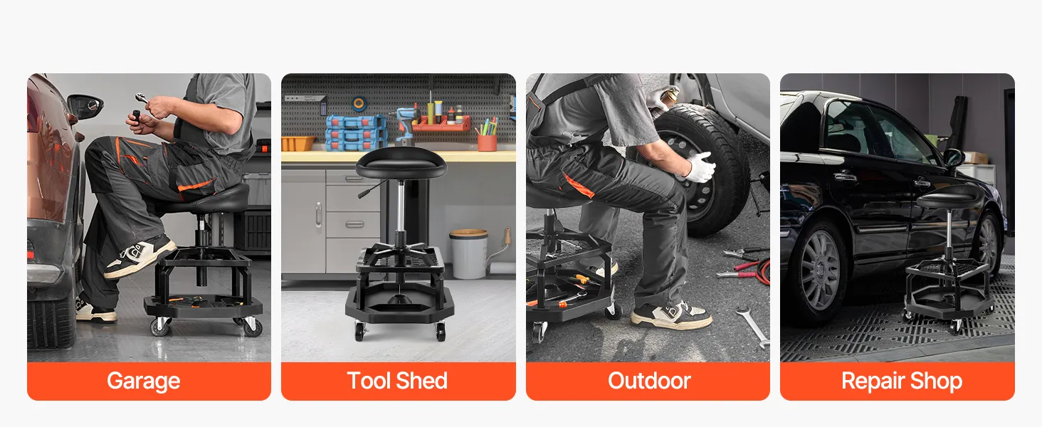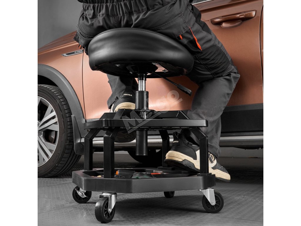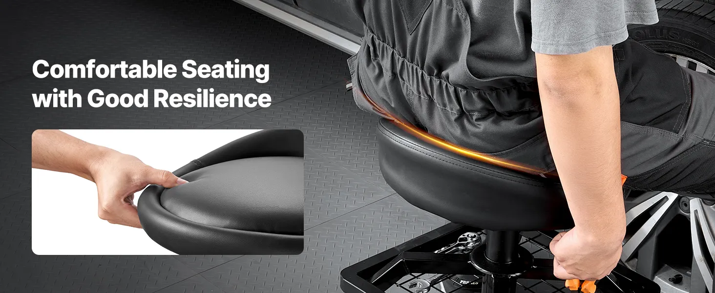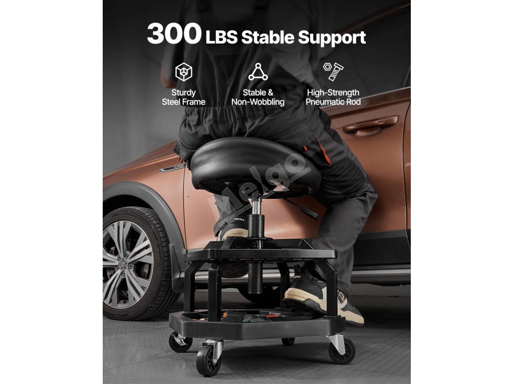 Naše sedadlo na opravu v garáži má odolný oceľový rám a zosilnené skrutky s nosnosťou 300 libier. Ponúka stabilitu, pohodlie a správnu výšku, vďaka čomu môžete pracovať bez dlhého ohýbania alebo kľačania.