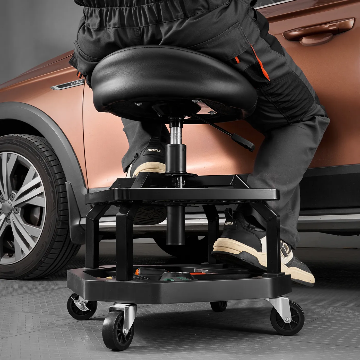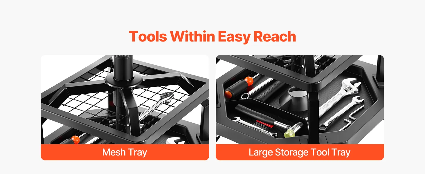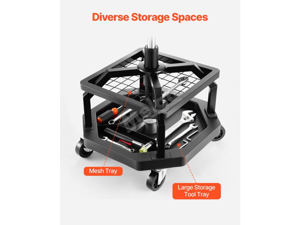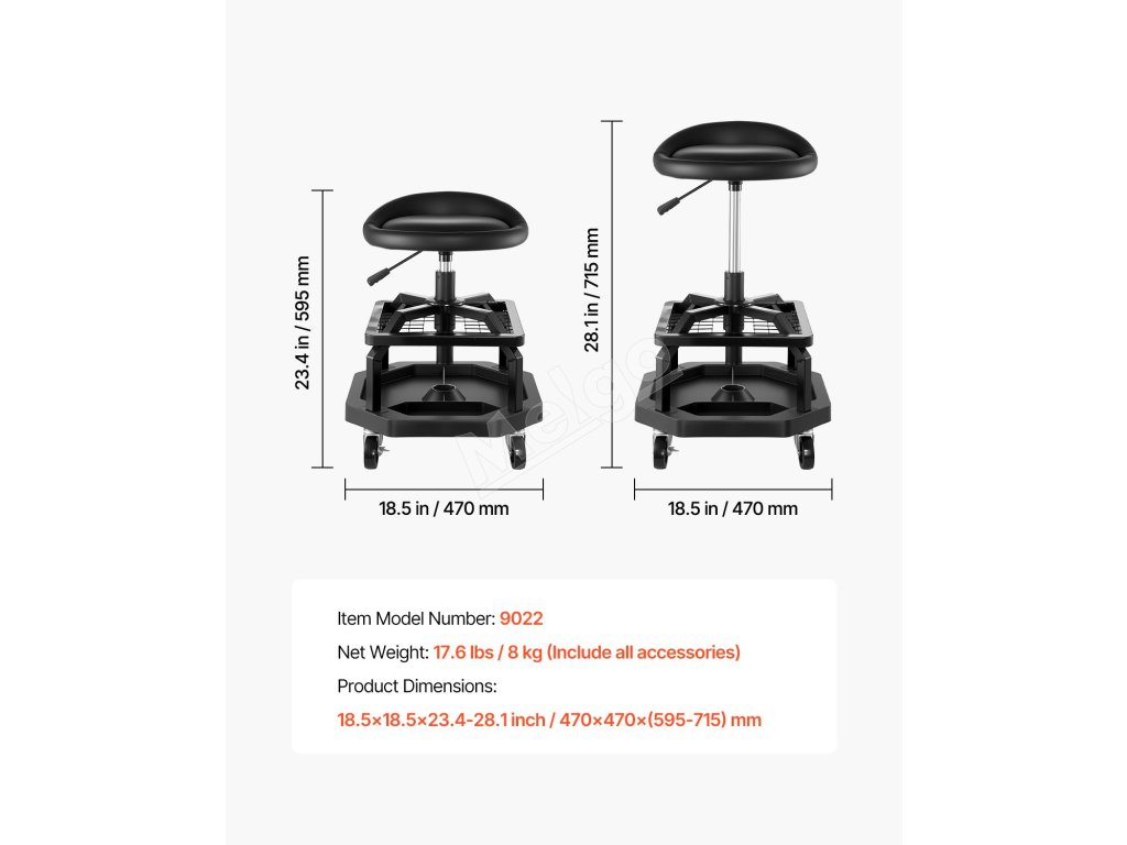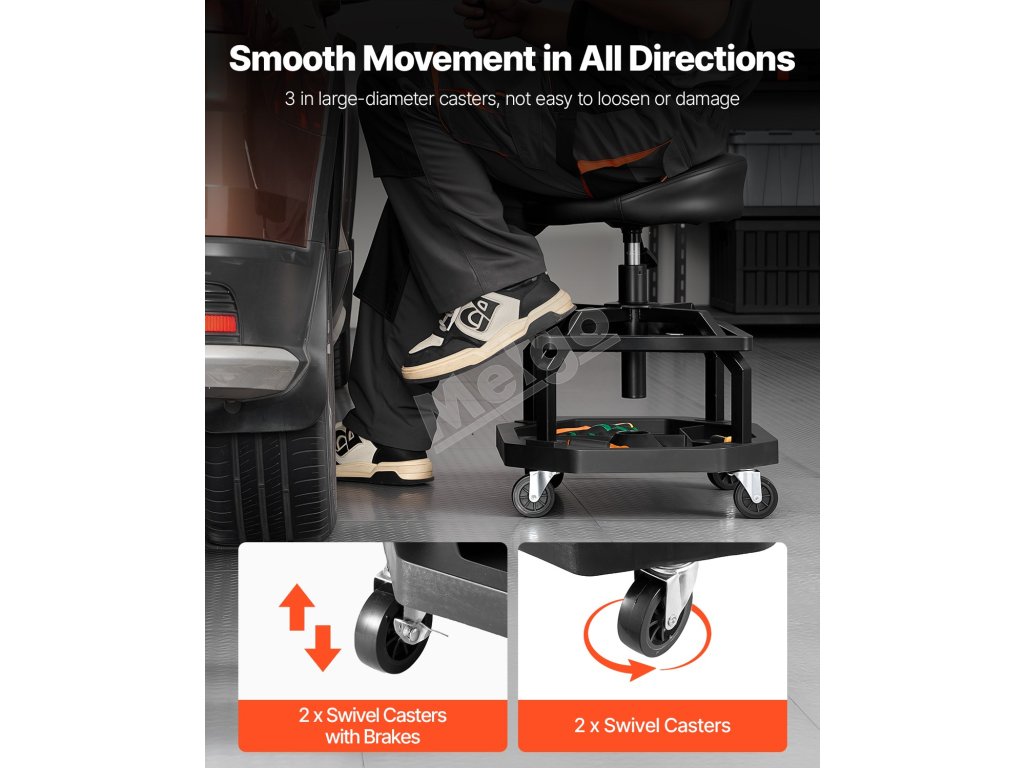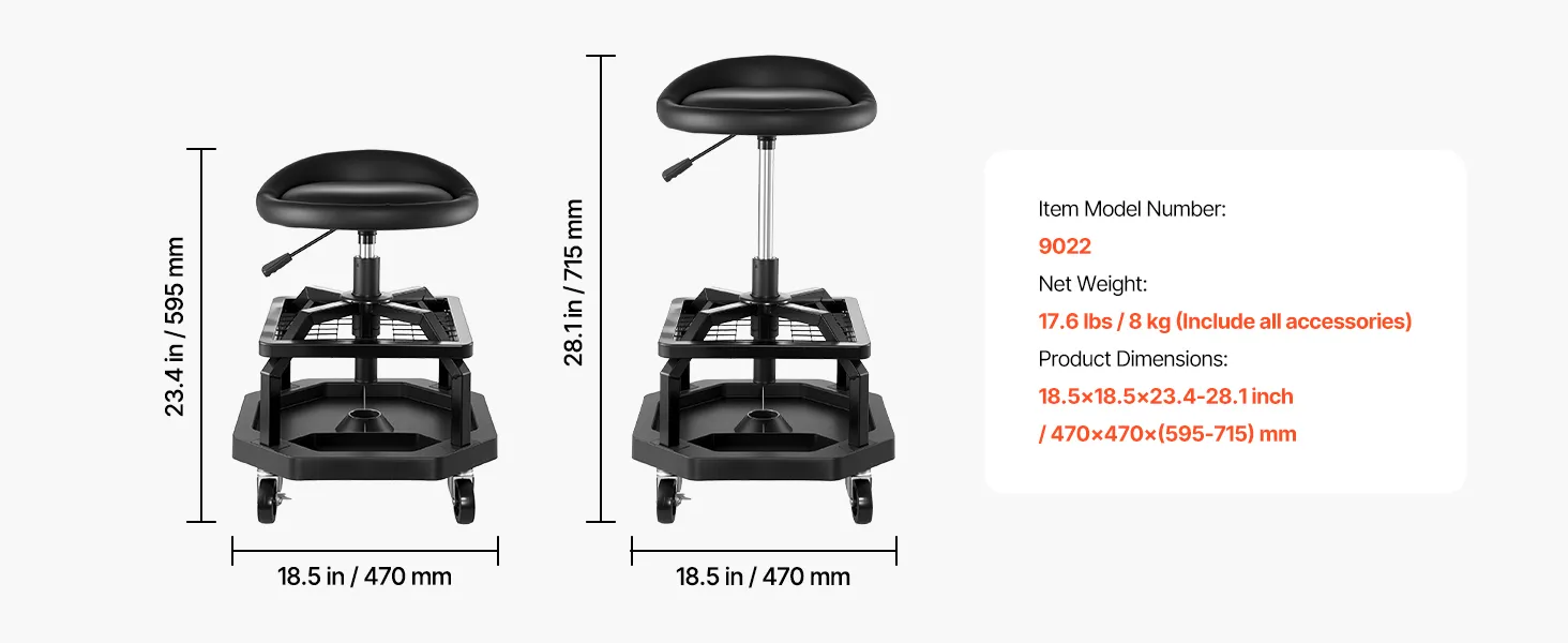 Naše sedadlo na opravu v garáži má odolný oceľový rám a zosilnené skrutky s nosnosťou 300 libier. Ponúka stabilitu, pohodlie a správnu výšku, vďaka čomu môžete pracovať bez dlhého ohýbania alebo kľačania.