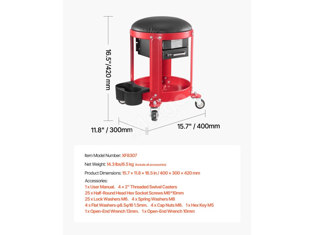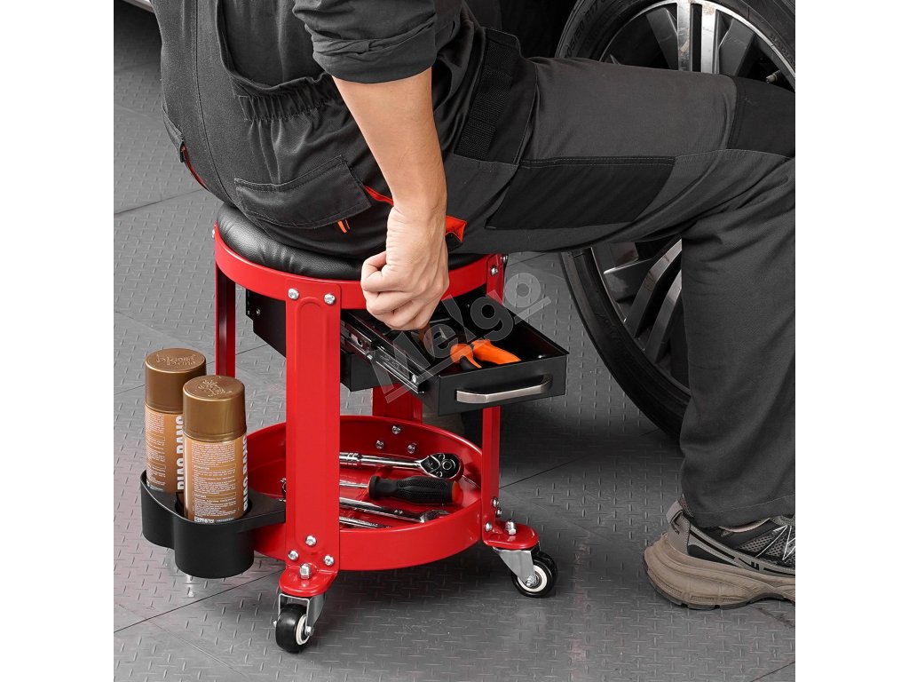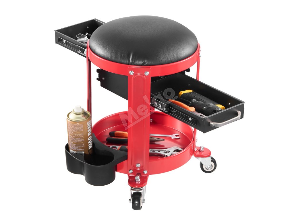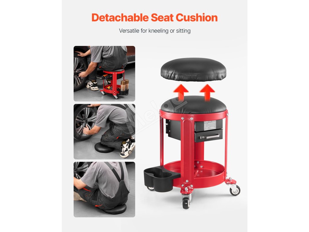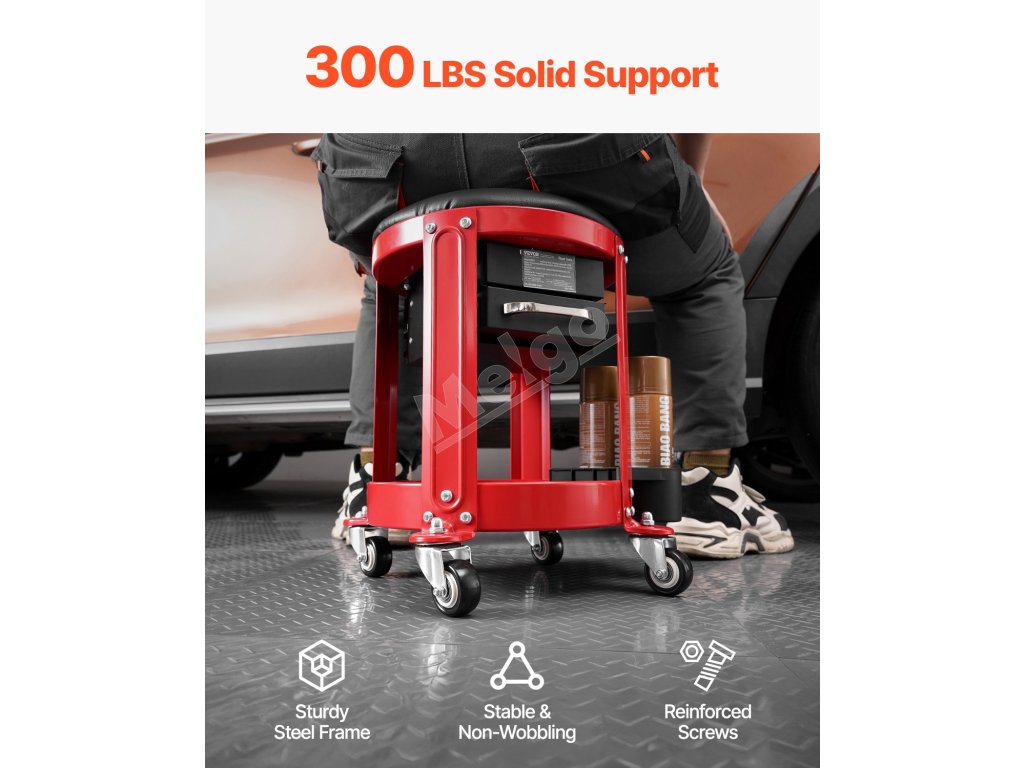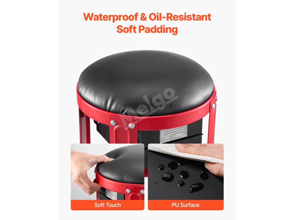 Naše sedadlo na opravu v garáži má odolný oceľový rám a zosilnené skrutky s nosnosťou 300 libier. Ponúka stabilitu, pohodlie a správnu výšku, vďaka čomu môžete pracovať bez dlhého ohýbania alebo kľačania.