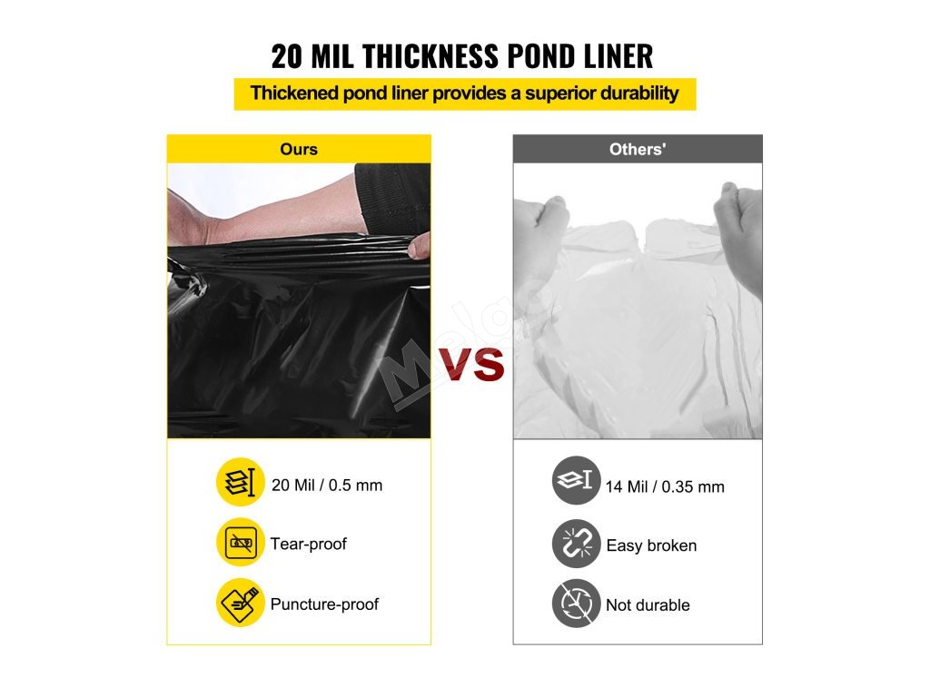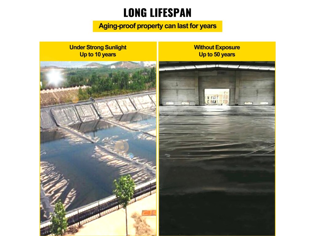 VEVOR LLDPE rybníková fólia ponúka skvelý pomer ceny a životnosti. Je vyrobená z materiálu LLDPE, ktorý zaručuje dlhú životnosť vášho jazierka. Výstelka môže vydržať od 10 do 50 rokov. Vďaka tomu je spoľahlivou voľbou v každom prodrome. Vďaka svojej hrúbke 20 milimetrov poskytuje silnú ochranu proti prepichnutiu a opotrebovaniu, čím zabezpečuje, že vaša voda zostane dlhé roky neporušená bez toho, aby sa porušila alebo popraskala. Čierna farba vložky dokonale splynie s okolitým prostredím. Je to hodnotná investícia, ktorá ponúka odolnosť aj dlhú životnosť. Preto je táto vysokokvalitná vložka do jazierka vynikajúcou investíciou, ktorá ponúka aj dlhodobú životnosť. Môžete ju použiť, ak pracujete na stavebných projektoch akéhokoľvek rozsahu. Dodatočná ochrana znamená menej výmen a údržby, čo vám časom ušetrí peniaze.