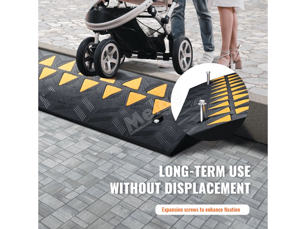Inštalácia gumovej obrubníkovej rampy VEVOR je neuveriteľne jednoduchá. Dodáva sa s kotvami na trvalú inštaláciu. Vďaka tomu rampa zostane na svojom mieste. Pevná gumová konštrukcia si vyžaduje minimálnu údržbu. Môžete sa na ňu spoľahnúť pri používaní vo vonkajšom prostredí. Čistenie terénu je jednoduché. Stačí ju opláchnuť vodou, aby ste odstránili nečistoty a úlomky. Protišmykový povrch zostáva účinný aj za mokra, dokonca aj keď je znečistený. To znamená bezpečnosť za každých podmienok. Odolnosť: Odolnosť rampy znamená, že vydrží roky s minimálnou údržbou. Preto slúži ako praktické a pohodlné riešenie prístupu k obrubníku.