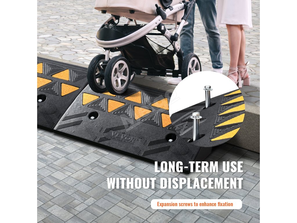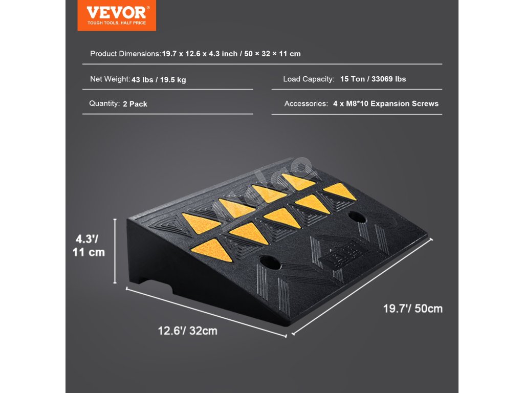 Gumová obrubníková rampa z radu gumových rámp VEVOR je navrhnutá tak, aby poskytovala pevné a spoľahlivé riešenie na prekonávanie obrubníkov, schodov alebo prahov. Tieto rampy sú vyrobené z vysokokvalitnej gumy a zvládnu veľké zaťaženie až do 33 069 libier alebo 15 ton. Vďaka tomu sú vhodné aj pre autá, invalidné vozíky, bicykle a motocykle.