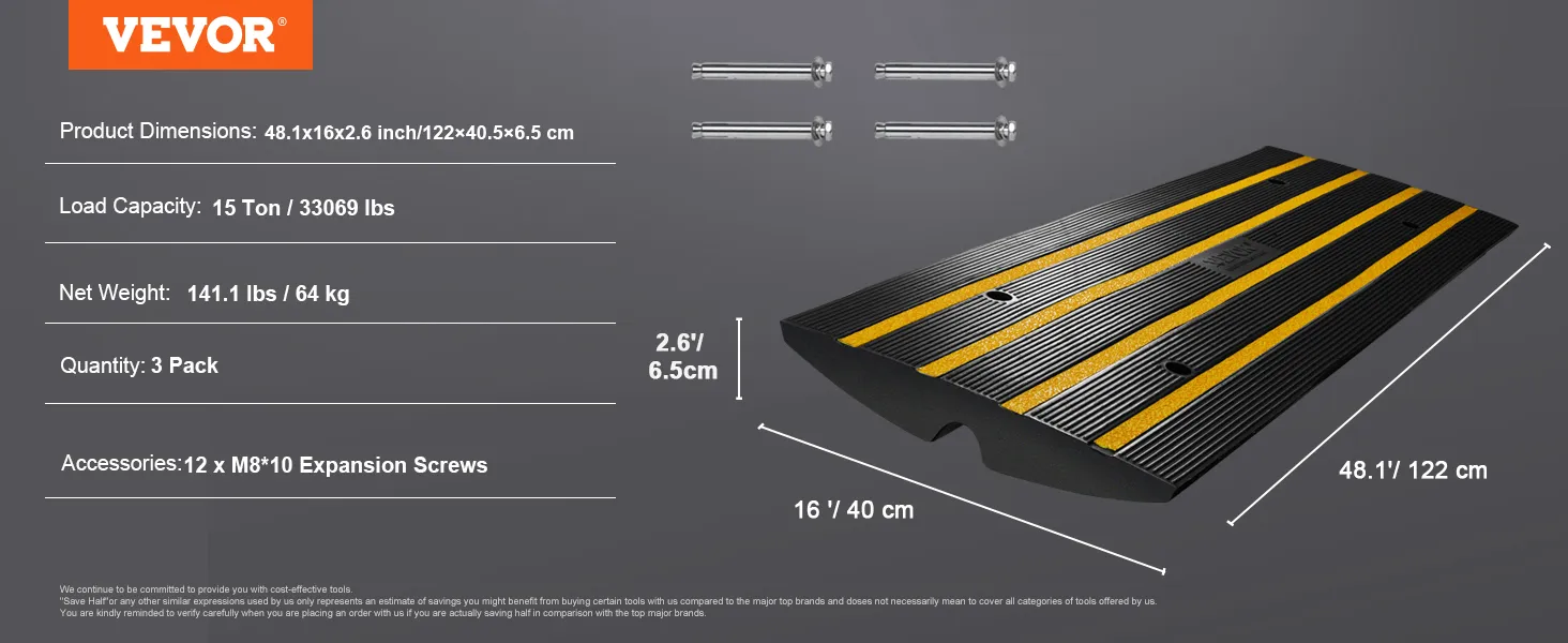 Výber gumených príjazdových rámp VEVOR znamená, že sa rozhodnete pre nákladovo efektívne riešenie. Napriek tomu, že majú vysokokvalitnú konštrukciu a odolnosť, tieto možnosti rámp sa dodávajú za konkurencieschopnú cenu. Vďaka tomu sú cenovo dostupnou voľbou pre každého, kto chce vylepšiť svoju príjazdovú cestu alebo nakladaciu rampu. Dlhá životnosť rampy znamená, že ich nebudete musieť často vymieňať, čo ďalej znižuje náklady. Ich schopnosť zabrániť poškodeniu vozidla vám tiež ušetrí peniaze za opravy. Či už ste majiteľom domu alebo firmy, táto kombinácia cenovej dostupnosti a vysokého výkonu robí z rampy VEVOR hodnotnú investíciu. Tieto rampy ponúkajú poddajné a ekonomické riešenie pre vaše potreby na príjazdovej ceste a nakladacej rampe.