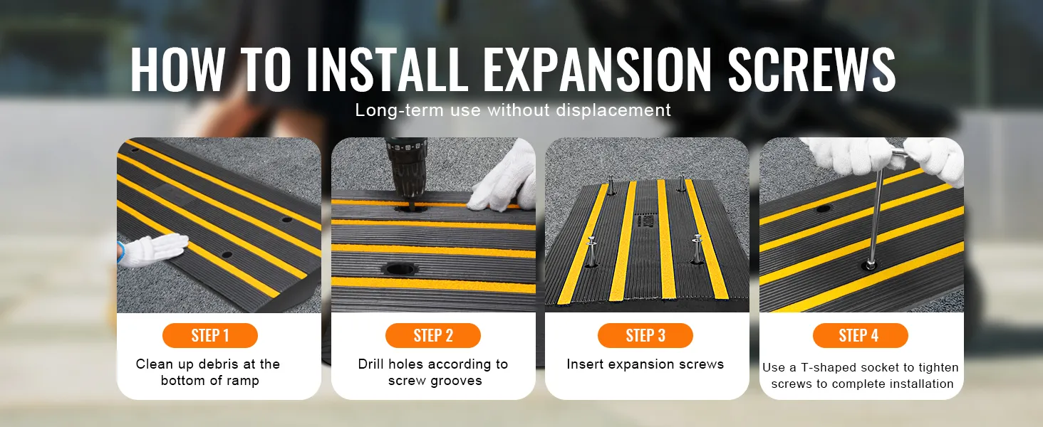 Gumené nájazdy VEVOR sa ľahko inštalujú. Každá rampa sa dodáva s predvŕtanými otvormi a potrebným montážnym hardvérom. Vďaka tomu môžete rampy ľahko upevniť na príjazdovú cestu alebo chodník. Po inštalácii zostanú nájazdové systémy na svojom mieste, čím sa eliminuje potreba ich neustáleho nastavovania. Údržba je tiež bezproblémová. Tieto konštrukcie rámp sú odolné voči poveternostným vplyvom, takže zostávajú funkčné a dlho dobre vyzerajú. Čierne a žlté pruhy nielenže dodávajú "profesionálny nádych", ale tiež zlepšujú viditeľnosť. Tieto možnosti rámp sa ľahko inštalujú a vyžadujú si minimálnu údržbu, takže sú vhodné do akéhokoľvek prostredia.