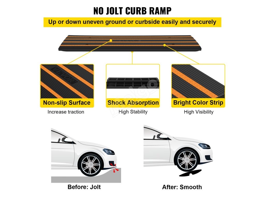 Gumené príjazdové rampy VEVOR majú protišmykový povrch. Vďaka tomu po nich môžu vozidlá bezpečne prechádzať. Je to dôležité najmä v mokrých podmienkach. Konštrukcia rampy tiež poskytuje výrečný prechod cez obrubníky. Tie zabraňujú prepadávaniu vozidiel na dno. Znižujete tak riziko poškodenia podvozku vozidla. Jasné žlté pruhy na rampových systémoch uľahčujú viditeľnosť. Pomáhajú vám vidieť aj za zhoršených svetelných podmienok. Tento dodatočný bezpečnostný prvok je veľmi dôležitý na predchádzanie nehodám, najmä na frekventovaných miestach, ako sú nakladacie rampy. Bezpečnostné prvky rámp poskytujú istotu pre každého majiteľa nehnuteľnosti.