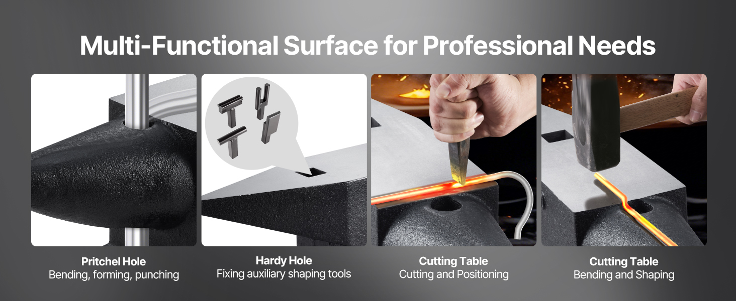 Zaoblený roh a plochý roh sa používajú na hladké ohýbanie a tvarovanie; pritchelov otvor a hardy otvor sú určené na príslušenstvo, dierovanie a ohýbanie.