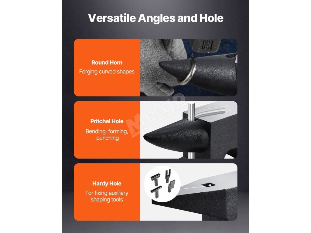 Táto oceľová kovadlina má dva rohy a otvory. Zaoblený roh a plochý roh sú určené na hladké ohýbanie a tvarovanie; otvory sú lepšie na dierovanie a ohýbanie príslušenstva. Je ideálna pre kovotepcov, nitovanie, rovnanie, kovanie a tvarovanie kovu, ideálna pre každého kutila alebo hobbyistu.