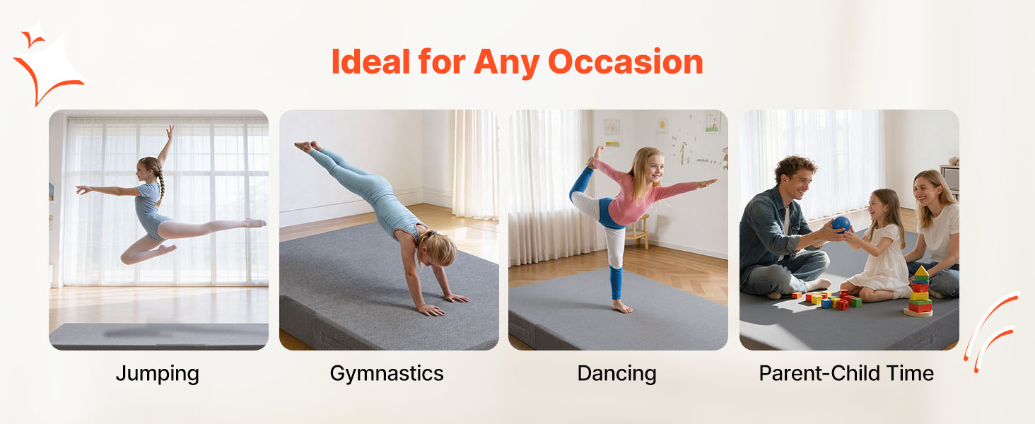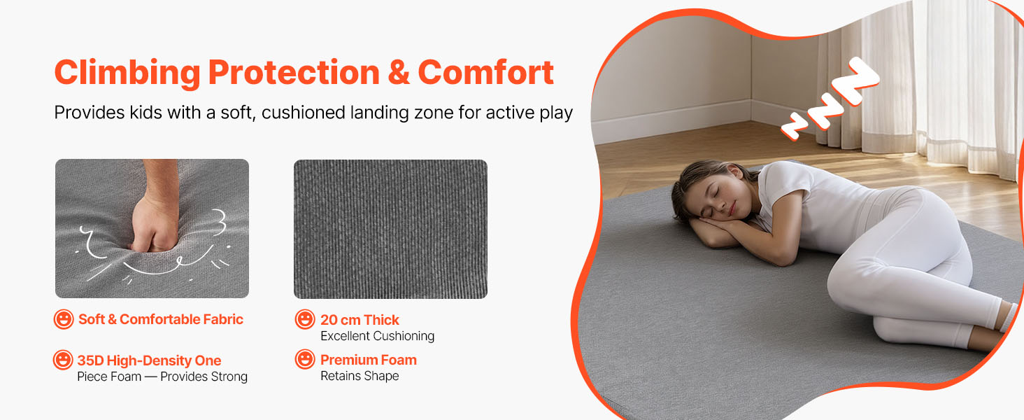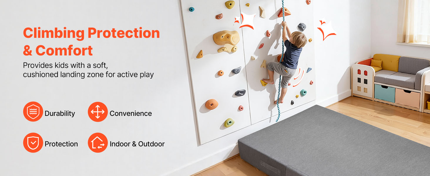 Podložka pre deti je vyrobená z 8-palcovej (20 cm) hrubej peny s vysokou hustotou a absorbuje nárazy pri lezení, skákaní na mini trampolíne alebo gymnastike. Znižuje namáhanie kolien, bedier a chrbtice a zároveň poskytuje uspokojivé odrazové vlastnosti a dlhodobé pohodlie.