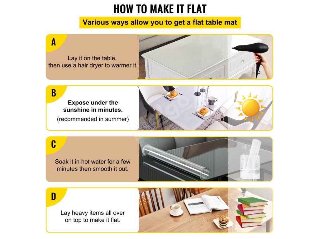 Môžete si vybrať rôzne spôsoby, ako urobiť podložku na stôl plochou. Napríklad fúkaním tepla fénom, vystavením na slnku, namočením do horúcej vody alebo umiestnením ťažkých predmetov, aby sa zabránilo vzniku bublín, ktoré ovplyvňujú krásu vašich nábytkových dosiek.