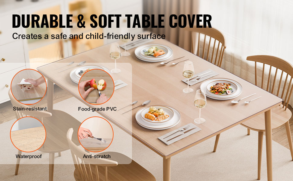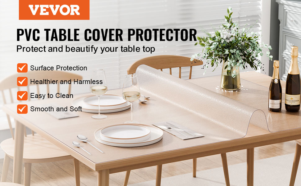 Priehľadný chránič stola je vyrobený z vysokokvalitného PVC materiálu, je odolný voči opotrebovaniu, poskytuje vynikajúcu protišmykovosť a odoláva vysokým teplotám. Môžete ich bez obáv používať priamo s potravinami. Užívajte si bezproblémový a čistý pracovný stôl!