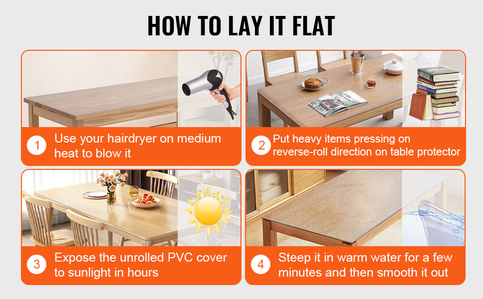 Ak bol chránič stola dlhší čas zrolovaný, použite tieto jednoduché tipy na obnovenie jeho hladkosti: Použite vyhrievaný sušič na fúkanie teplého vzduchu cez chránič stola. Vystavte chránič stola slnečnému svetlu. Alebo ho zrolujte v opačnom smere a zaťažte ho, aby sa vyrovnal.