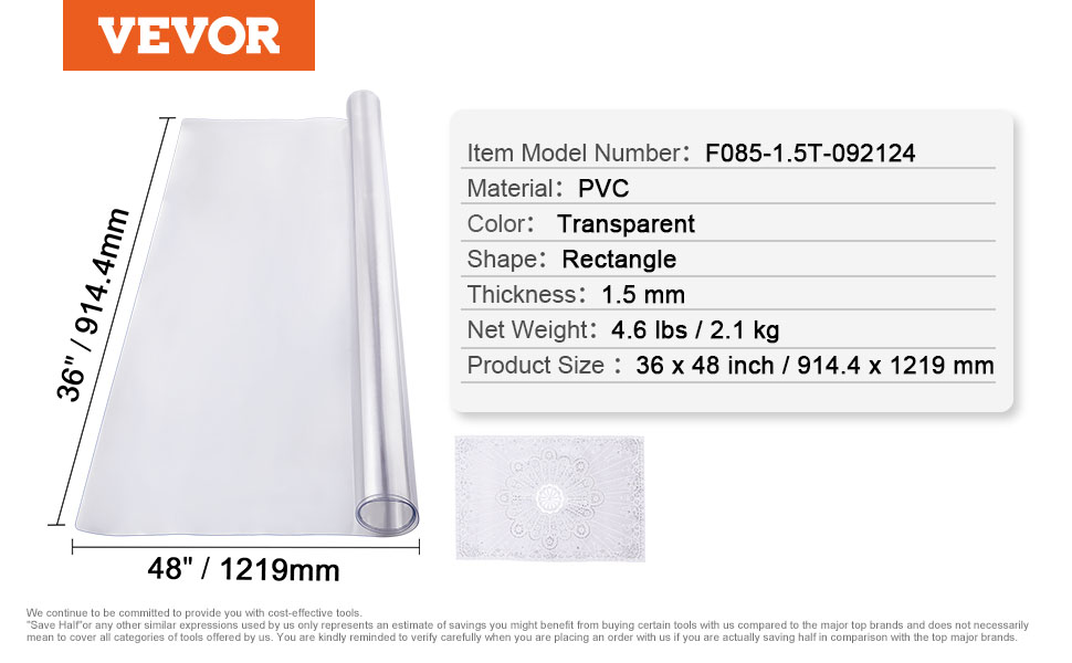 Plastový obrus na stôl 36×48 Inch 1.5 mm priehľadný vodotesný pvc