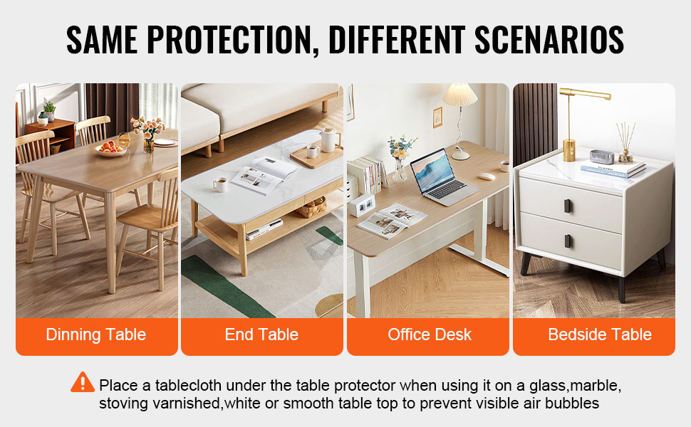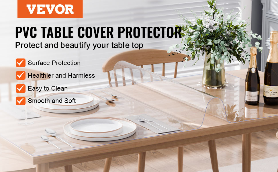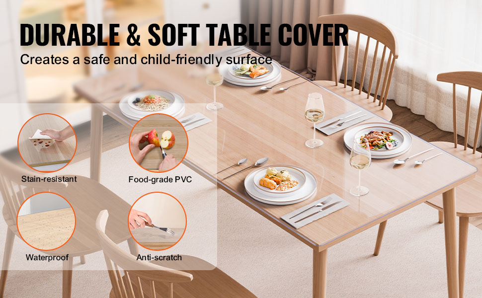 Priehľadný chránič stola je vyrobený z vysokokvalitného PVC materiálu, je odolný voči opotrebovaniu, poskytuje vynikajúcu protišmykovosť a odoláva vysokým teplotám. Môžete ich bez obáv používať priamo s potravinami. Užívajte si bezproblémový a čistý pracovný stôl!