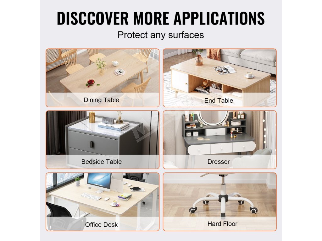 Naša priehľadná ochrana stola poskytuje prvotriednu ochranu a zvýrazňuje estetiku vášho stola. Vyskúšajte vynikajúcu kvalitu, mäkkosť a hladkosť materiálov, ktoré sú navrhnuté tak, aby vydržali a boli ľahko čistiteľné. Či už ide o jedálenský stôl, kuchynskú linku, písací stôl alebo podložku na podlahu či spotrebič.