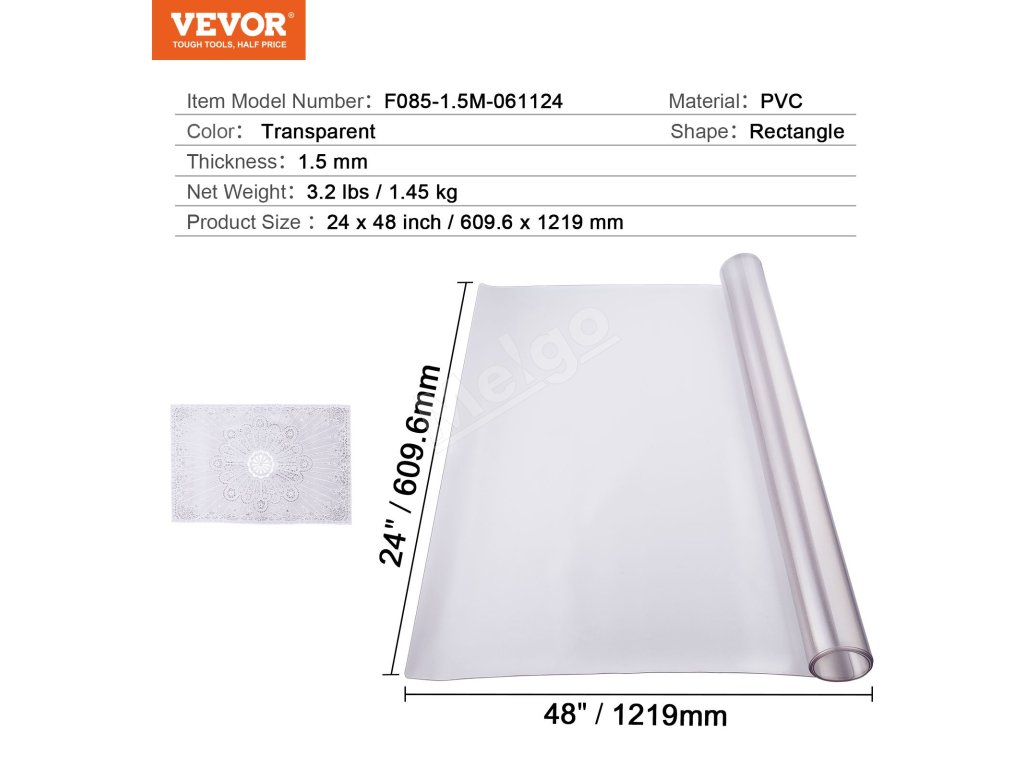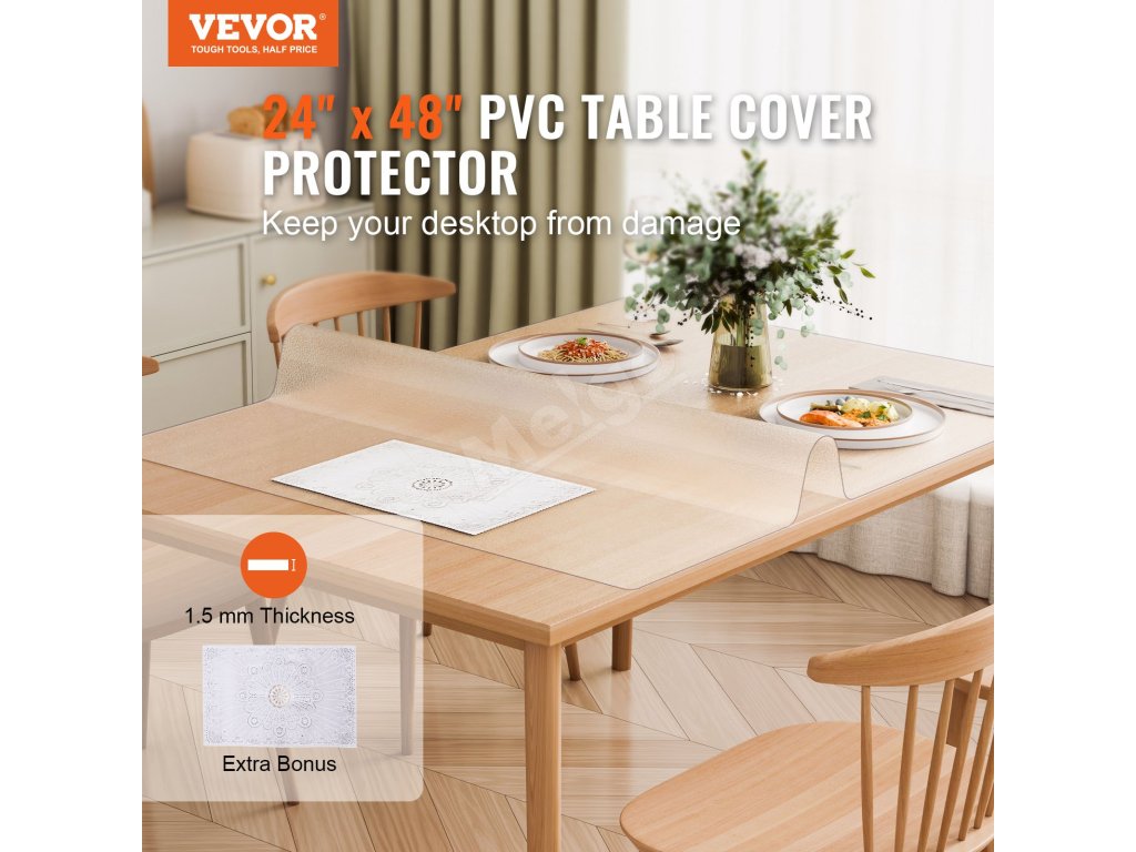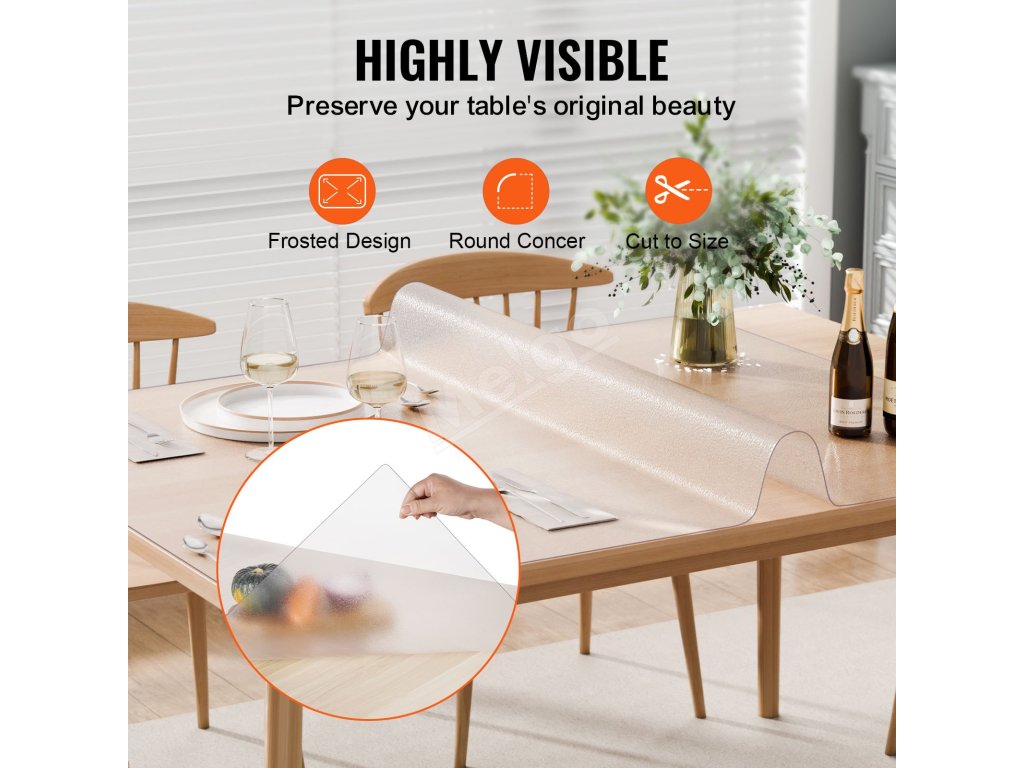 Priehľadný chránič stola je vyrobený z vysokokvalitného PVC materiálu, je odolný voči opotrebovaniu, poskytuje vynikajúcu protišmykovosť a odoláva vysokým teplotám. Môžete ich bez obáv používať priamo s potravinami. Užívajte si bezproblémový a čistý pracovný stôl!