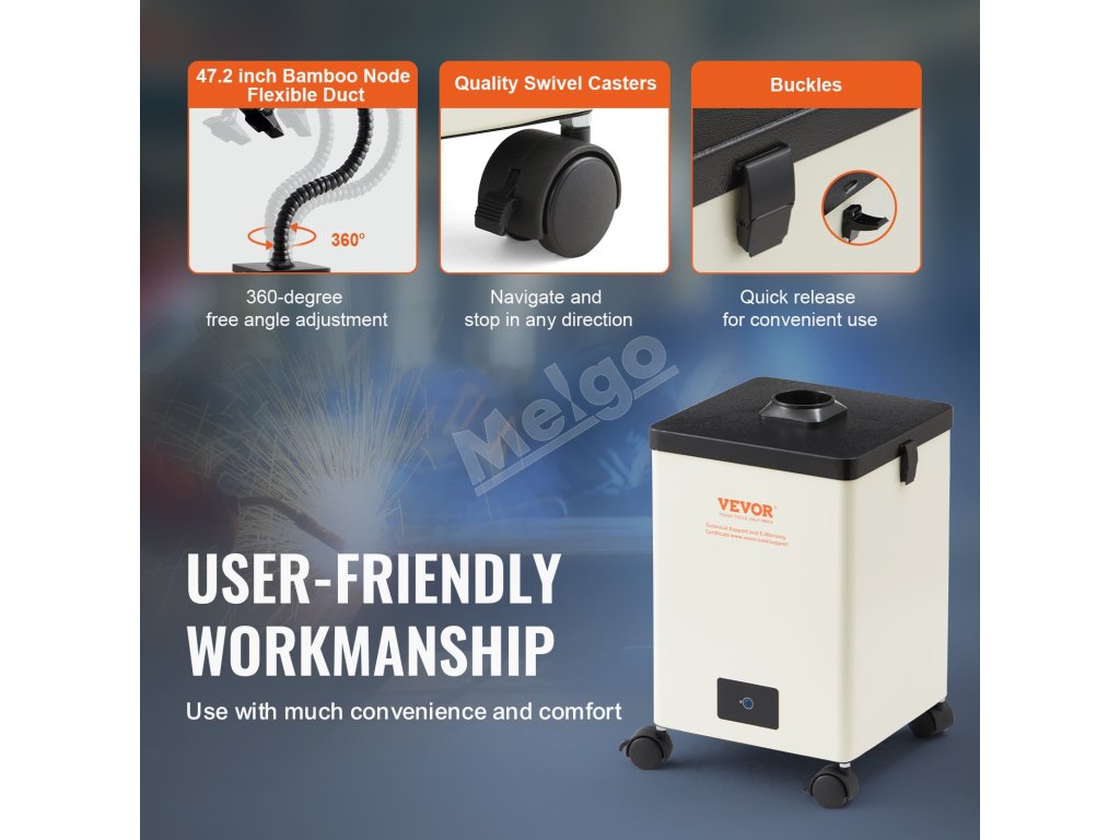 47.2-palcová flexibilná hadica, ktorú možno voľne ohýbať, spolu so 4 vysokokvalitnými univerzálnymi kolieskami (2 s brzdami), vďaka ktorým sa dá ľahko premiestňovať a zabezpečiť v akejkoľvek polohe. Vysoko tesniaca konštrukcia zabezpečuje, že kovové západky pevne uzavrú hlavný objem filtra, úplne utesnia výpary a zabránia tak akémukoľvek úniku.