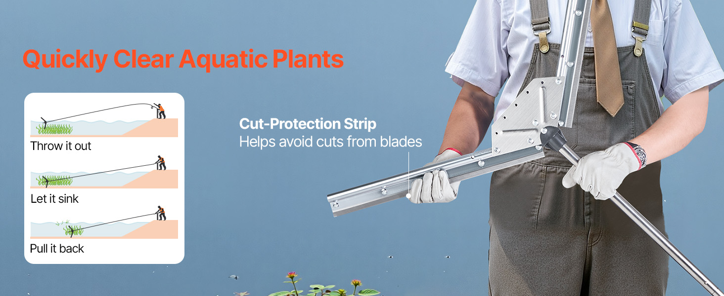 Tento rezač buriny na jazero je vyrobený z odolných oceľových čepelí, pozinkovaného železa a nerezovej rukoväti a obsahuje 30-stopové vysokopevnostné nylonové lano pre hladkú prevádzku. Odolné materiály zostávajú ostré a pomáhajú vám bez námahy odstraňovať burinu po celé roky.