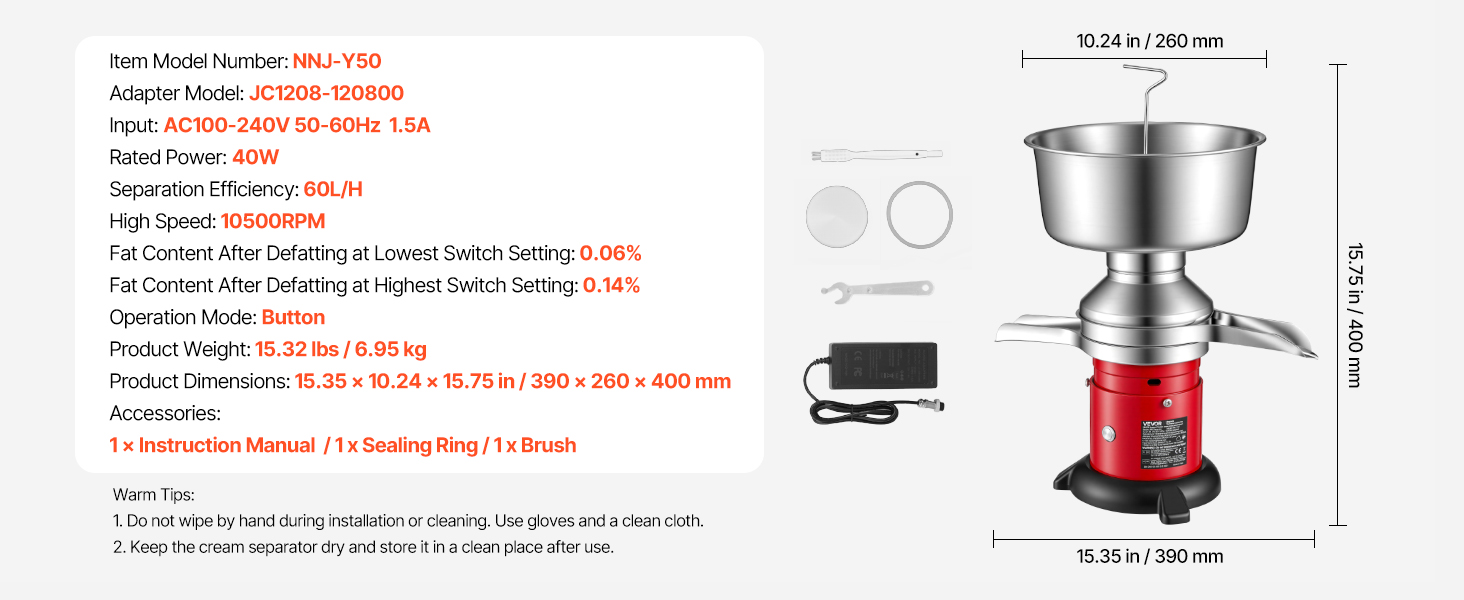 Tento elektrický oddeľovač mlieka a smotany dokáže oddeľovať suroviny rýchlosťou 60 l/h, pracuje pri vysokých otáčkach 10 500 ot/min a podporuje nastaviteľný pomer oddelenia tuku od 0,06 % do 0,14 %, čím zabezpečuje efektívne oddelenie odstredeného mlieka a smotany.
