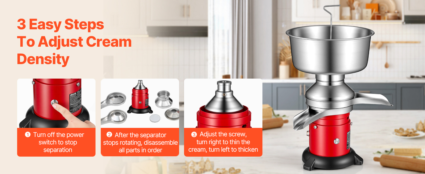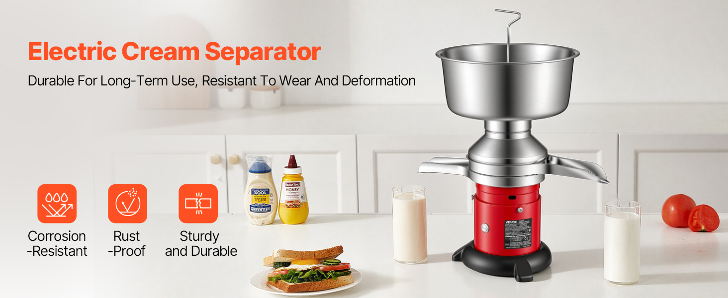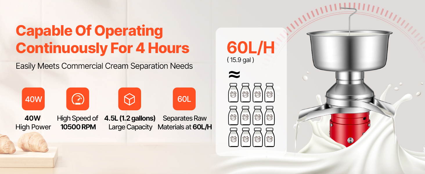 Tento odstredivý separátor mlieka a smotany je vybavený výkonným motorom s výkonom 40 W a veľkokapacitnou nádržou na mlieko s objemom 4,5 l (1,2 gal) a podporuje nepretržitú prevádzku až 4 hodiny, čím ľahko spĺňa potreby domácností, fariem atď.