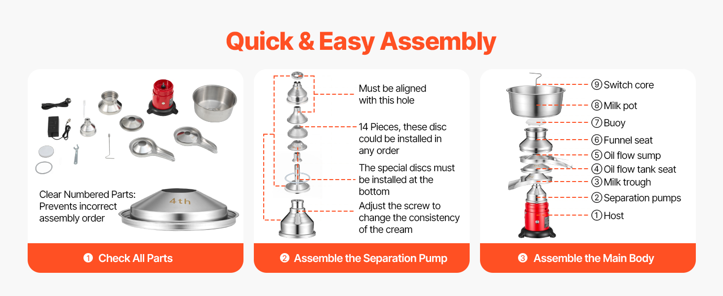 Jasne očíslované diely a podrobný montážny diagram zaisťujú jednoduchú a intuitívnu montáž. Stačí skontrolovať všetky komponenty, zmontovať oddeľovacie čerpadlo v správnom poradí a dokončiť montáž hlavného telesa.