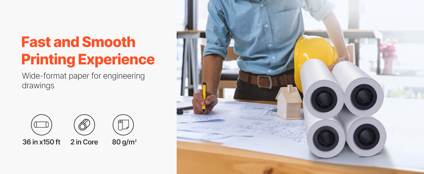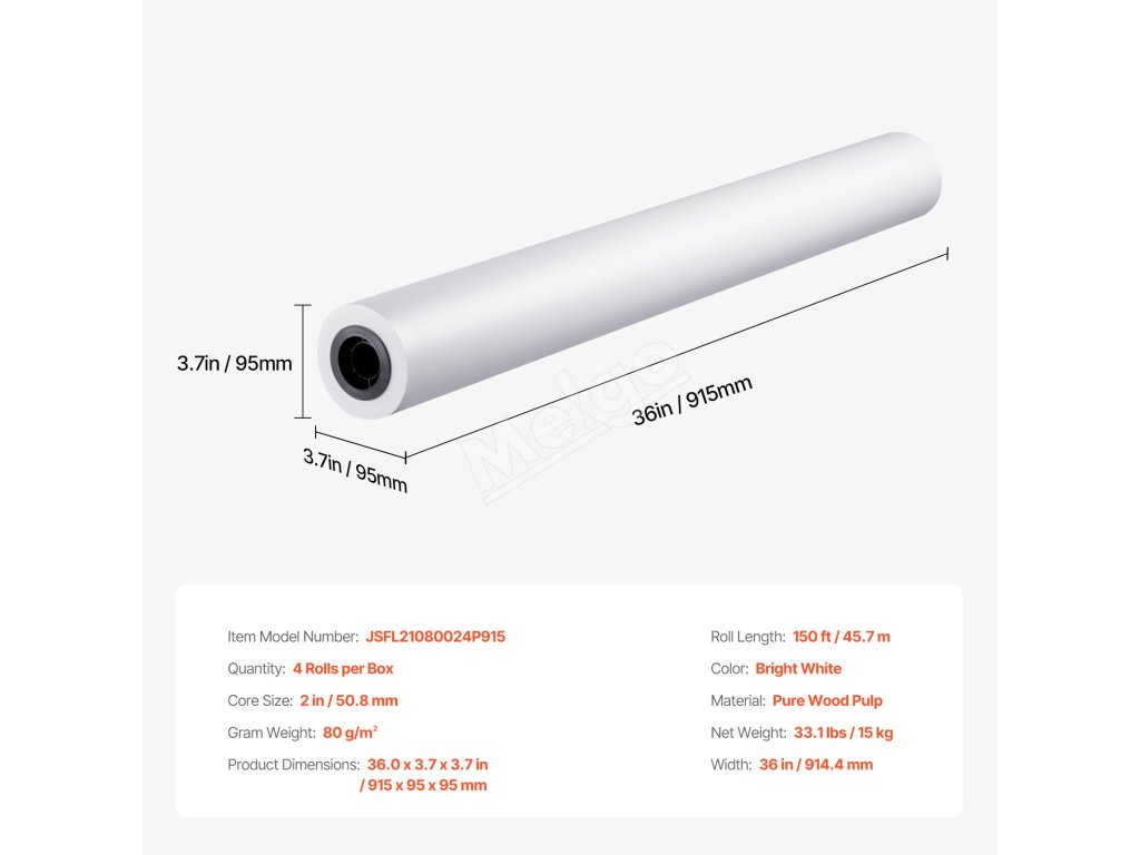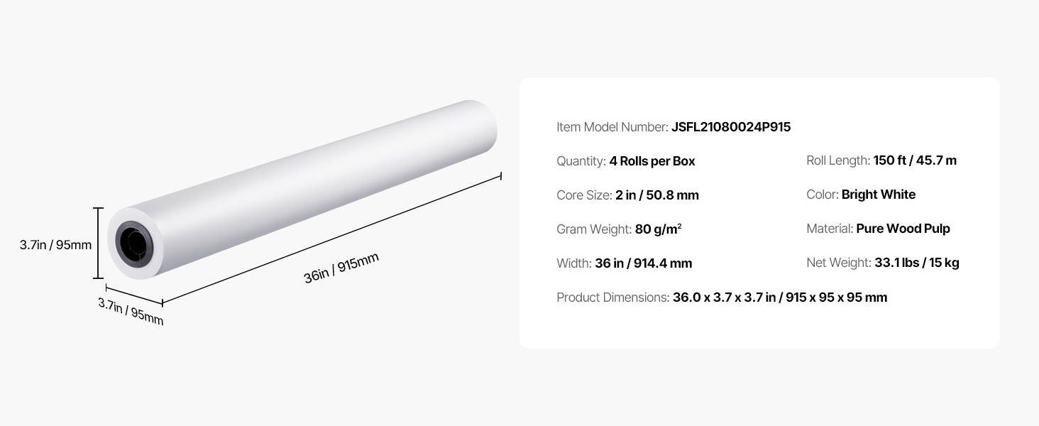 Toto balenie veľkoformátového papiera obsahuje štyri kotúče, každý so šírkou 36 palcov a dĺžkou 150 stôp, s presným meraním 80 g/m² pre konzistentné a vysokokvalitné výsledky. Dvojpalcové jadro je vhodné pre väčšinu štandardných plotrových tlačiarní.