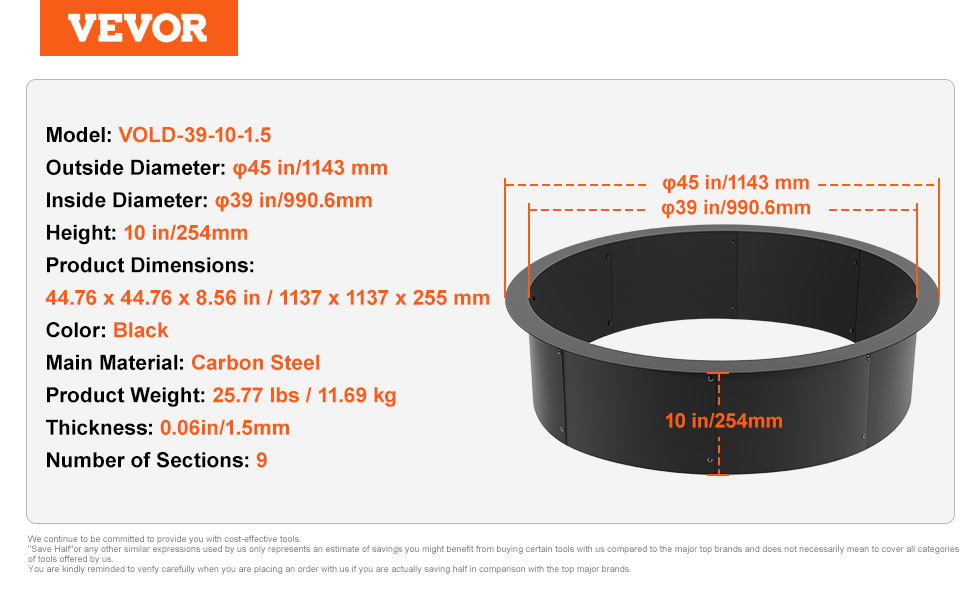 Kruh do ohniska 45-inch/39-inch priemer, výška 10 inch, uhlíková oceľ