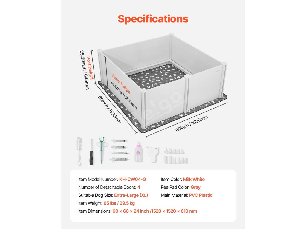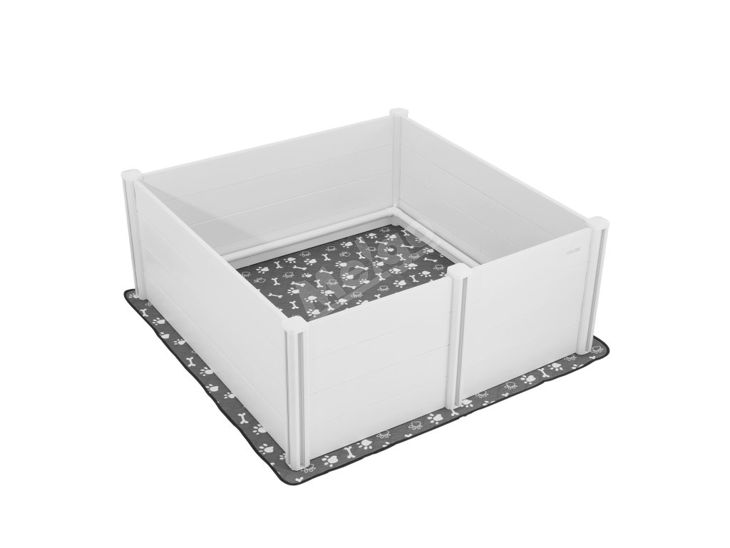 Súčasťou je vodotesná, opakovane použiteľná podložka na močenie s rozmermi 65,3 × 65,3 palca/1660 × 1660 mm a súprava na kŕmenie šteniat. Podložka udržiava priestor suchý a pohodlný, zatiaľ čo súprava na kŕmenie podporuje rané štádium rastu s pokojom.