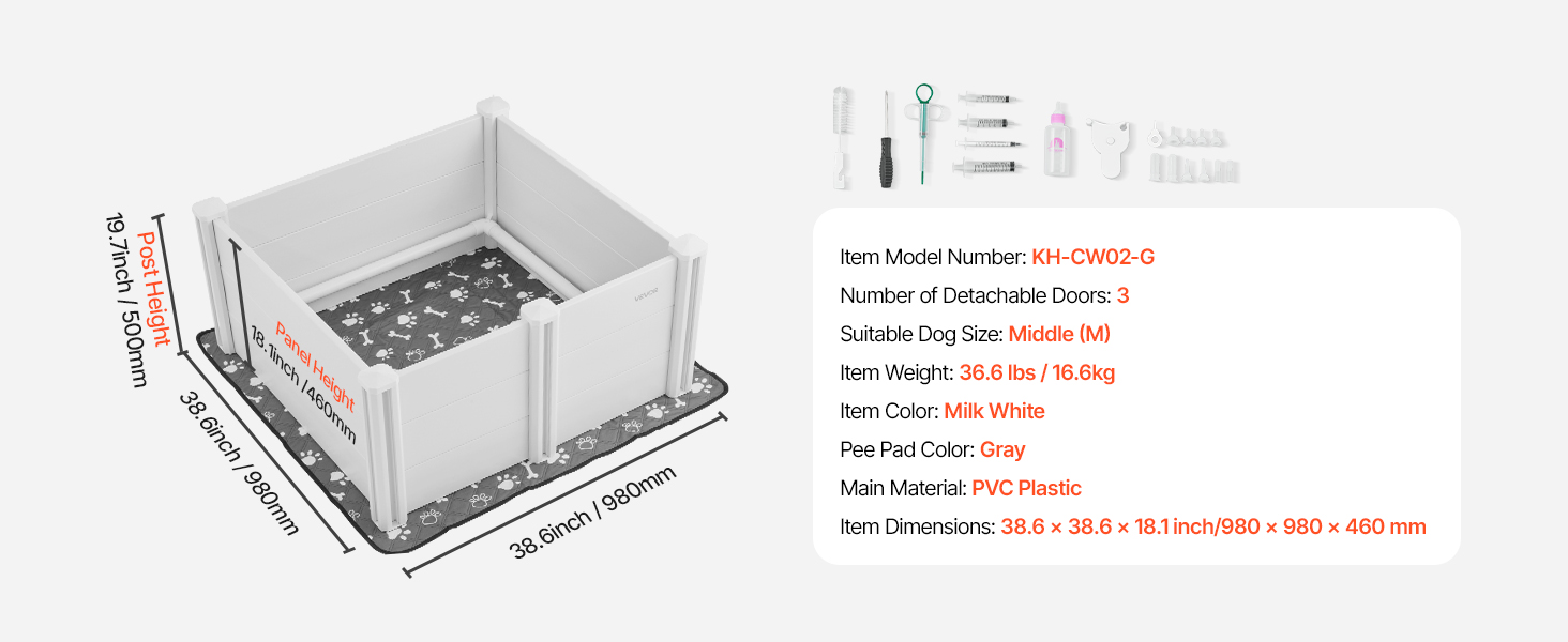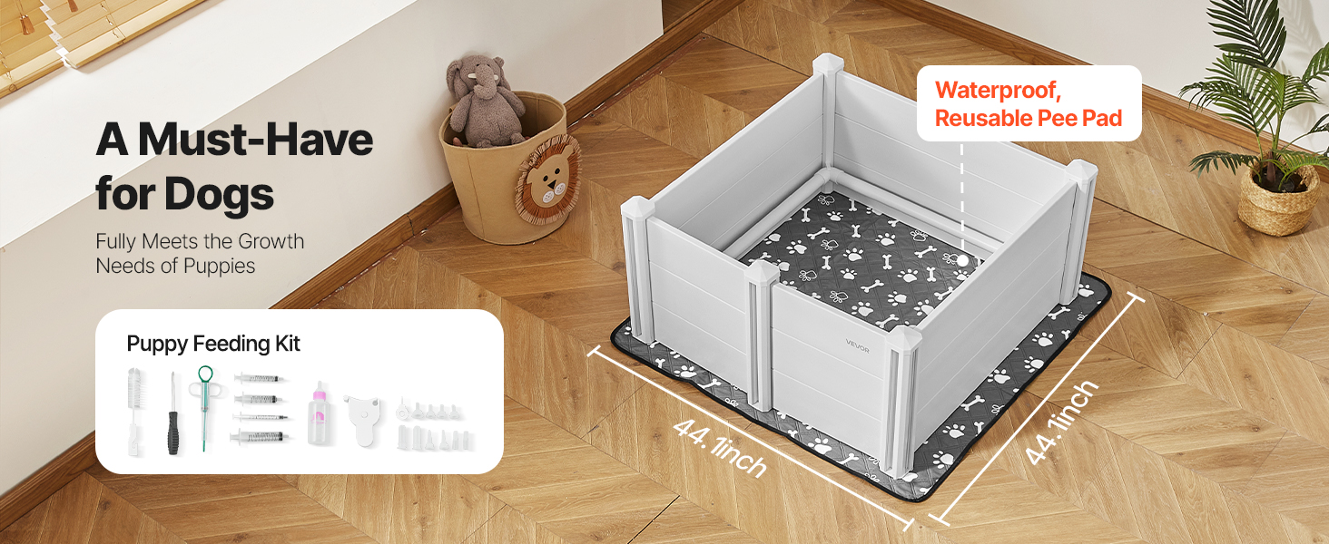 Súčasťou je vodotesná, opakovane použiteľná podložka na močenie s rozmermi 44,1 × 44,1 palca/1120 × 1120 mm a súprava na kŕmenie šteniat. Podložka udržiava priestor suchý a pohodlný, zatiaľ čo súprava na kŕmenie podporuje rané štádium rastu s pokojom.