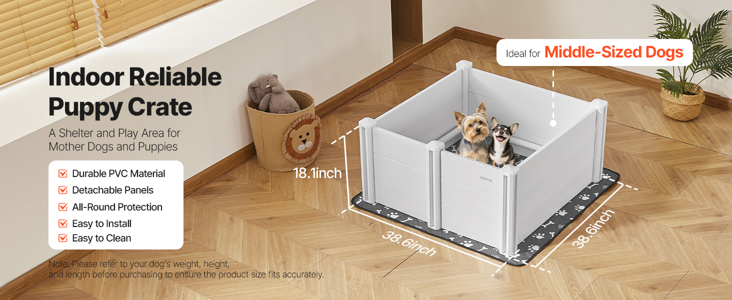 Priestranný 38,6x38,6x18,1 palca/980x980x460 mm box na pelešenie s umývateľnou podložkou na močenie pre stredne veľké psy! Je vyrobený z odolného, vodeodolného PVC, ľahko sa čistí a jeho nastaviteľná výška dvierok sa prispôsobuje rastu šteniat. Vďaka prehľadným vodiacim šípkam je nastavenie tiež bezproblémové. Pred kúpou si prosím POTVRĎTE veľkosť psa.