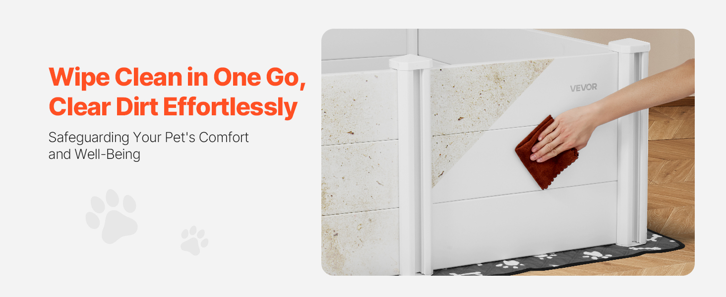 Ploché povrchy panelov sa ľahko čistia len vlhkou handričkou. Tento rýchly a účinný spôsob čistenia pomáha znižovať riziko ochorenia a udržiava priestor vášho domáceho maznáčika svieži a čistý.