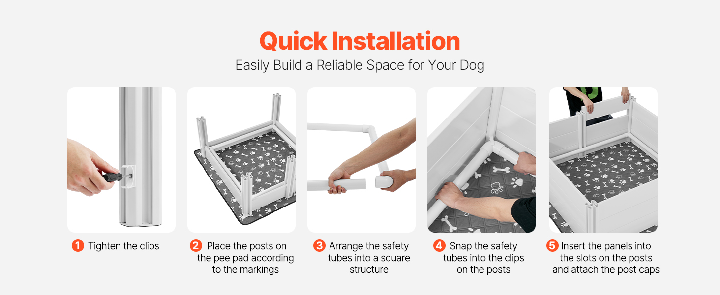 Táto plastová ohrádka pre psov je vybavená zacvakávacími konektormi, predvŕtanými otvormi na stĺpiky a laserom vygravírovanými šípkami pre bezproblémové nastavenie. Nie je potrebné žiadne náradie ani dohady.