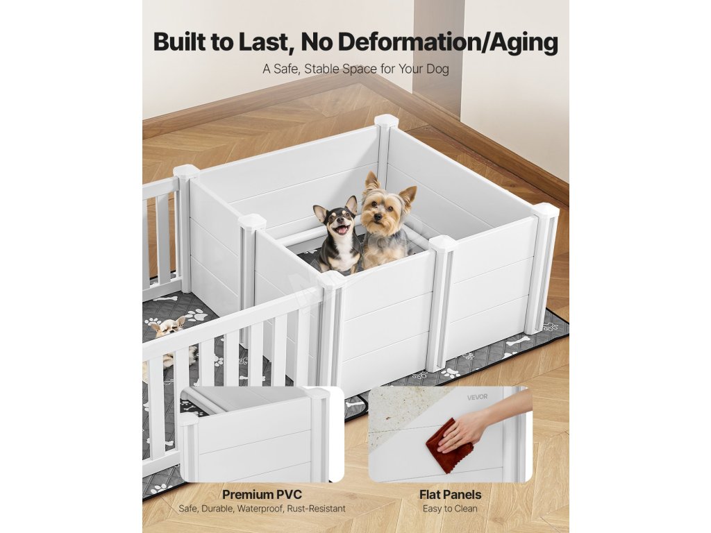 Tento koterec pre psov s rozmermi 73,43 × 38,19 × 19,69 palcov poskytuje priestranný a pohodlný priestor na rast. Je vyrobený z kvalitného PVC, je odolný, vodotesný, odolný proti hrdzi a ľahko sa čistí. Výška dvierok je nastaviteľná, čo zaručuje bezpečnosť vášho domáceho maznáčika. Veľká močová podložka je absorpčná a odolná proti úniku.