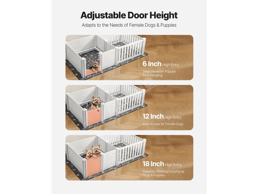Vnútorné koľajničky zabraňujú stláčaniu šteniat a znižujú riziko udusenia. Dno je vybavené protišmykovým lepidlom 3M, ktoré zabraňuje nakláňaniu a zabezpečuje stabilitu. Rozšíriteľné časti umožňujú flexibilný rast priestoru, keď váš pes dospieva, a spĺňajú všetky jeho vývojové potreby.