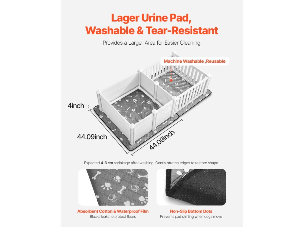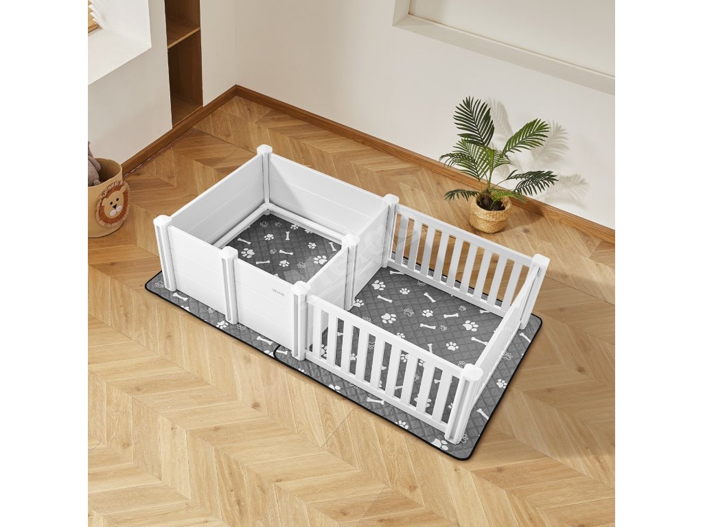 Súčasťou koterca pre psov je vodotesná, opakovane použiteľná podložka na močenie s rozmermi 1120 x 1120 mm / 44,09 x 44,09 a súprava na kŕmenie šteniat. Podložka na močenie udržiava priestor suchý a čistý, zatiaľ čo kŕmna súprava podporuje zdravý rast a plne podporuje vývoj vášho šteňaťa.