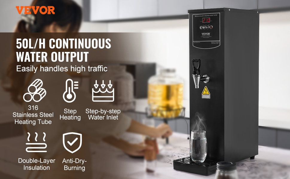 S výkonom až 50 litrov za hodinu dokáže tento komerčný bojler nepretržite servírovať 200 šálok po 250 ml, vďaka čomu vaši hostia nikdy nebudú musieť čakať na teplú vodu, a to ani počas špičky.
