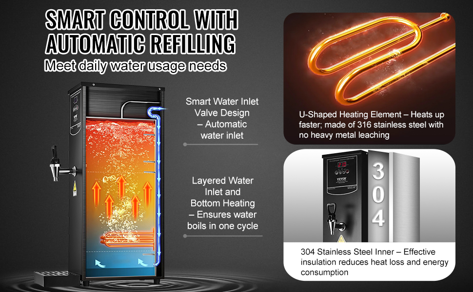 Vykurovacia trubica z nehrdzavejúcej ocele 316 zabezpečuje vodu bez obsahu ťažkých kovov na zdravé pitie. Plne automatický prívod vody eliminuje potrebu ručného dopĺňania, zatiaľ čo systém postupného ohrevu ohrieva len to, čo potrebujete, čím znižuje plytvanie a spotrebu energie.