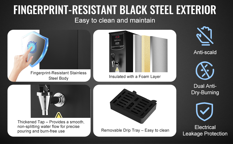 Čierne oceľové telo odolné voči odtlačkom prstov sa ľahko čistí, vďaka čomu bude vaše zariadenie vyzerať profesionálne. Odolný interiér z nehrdzavejúcej ocele 304 zaručuje, že nevzniknú žiadne zvláštne pachy, a poskytuje dlhotrvajúci výkon. Vďaka odnímateľnej odkvapkávacej miske je čistenie hračkou.
