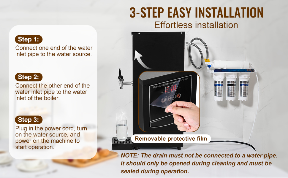 Pre rýchlu a bezproblémovú inštaláciu stačí pripojiť jeden koniec vodnej hadice k zdroju vody a druhý koniec k prívodu do kotla. Vzhľadom na rôznu kvalitu vody v rôznych oblastiach odporúčame čistiť bojler na teplú vodu každé 1 - 2 mesiace, aby sa zachoval optimálny výkon.