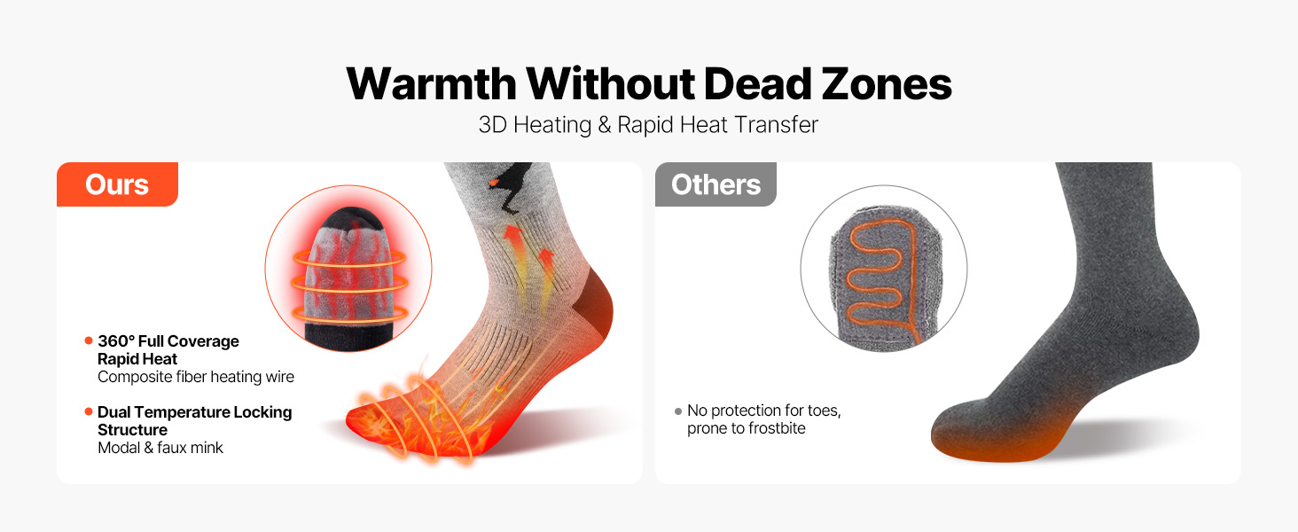Vyhrievacie drôty batériových vyhrievaných ponožiek obopínajú prednú časť chodidla a účinne šíria teplo. Vysokokvalitné materiály uzamykajú teplo, čím zabezpečujú maximálne pohodlie pre dlhotrvajúce teplo počas celého dňa.