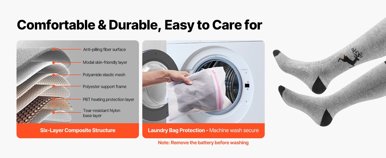 Vďaka špeciálnemu vrecku na pranie možno tieto dobíjacie vyhrievacie ponožky prať bez toho, aby stratili svoj tvar alebo teplo. Modalová tkanina je mäkká, odolná voči krčeniu a ľahko sa udržiava.
