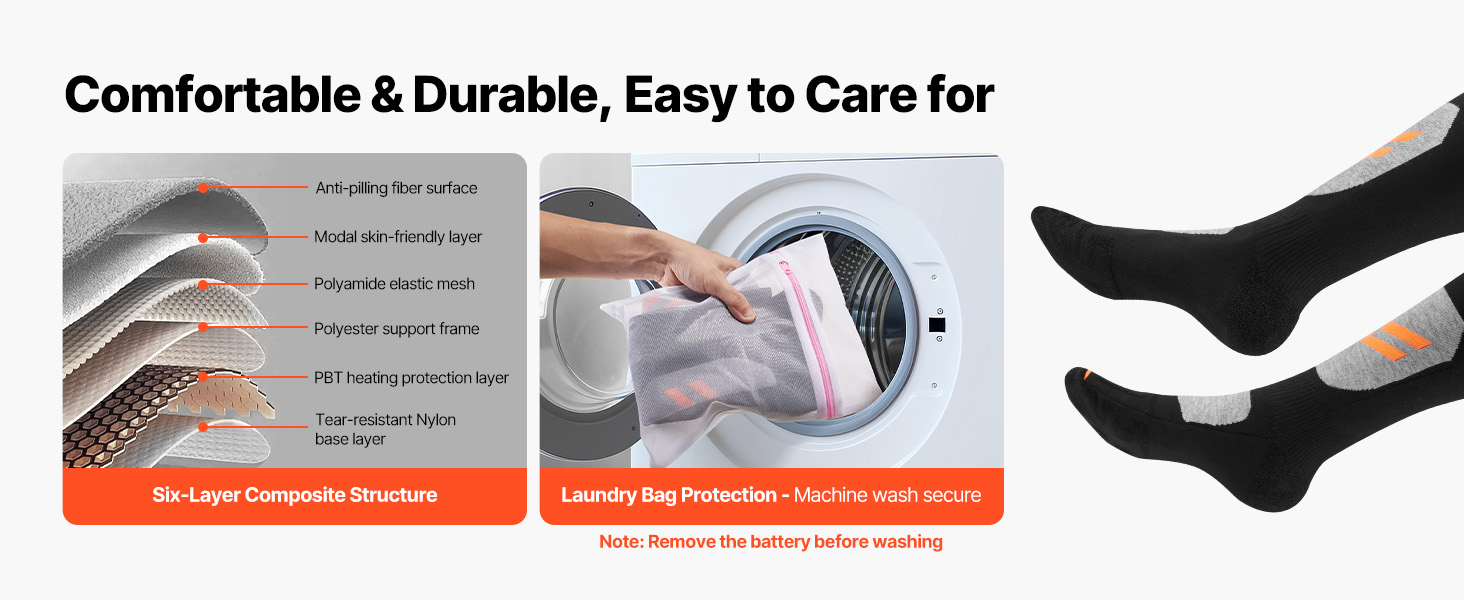 Vďaka špeciálnemu vrecku na pranie možno tieto dobíjacie vyhrievacie ponožky prať bez toho, aby stratili svoj tvar alebo teplo. Modalová tkanina je mäkká, odolná voči zrážaniu a ľahko sa udržiava.