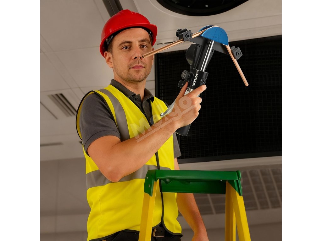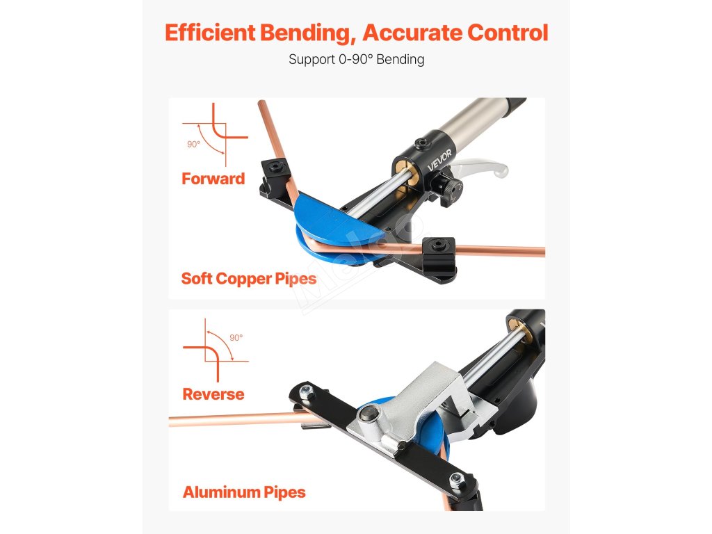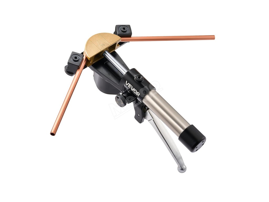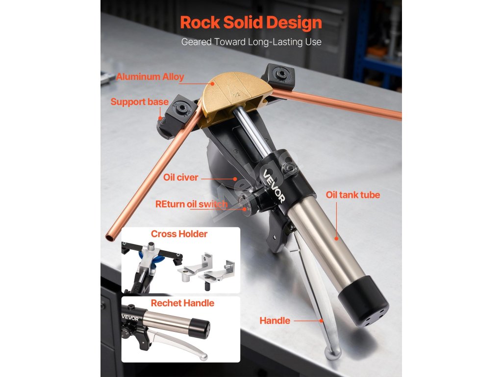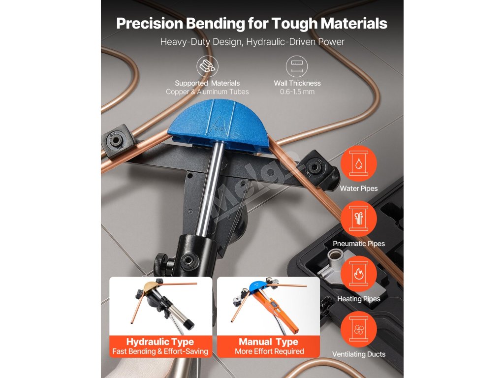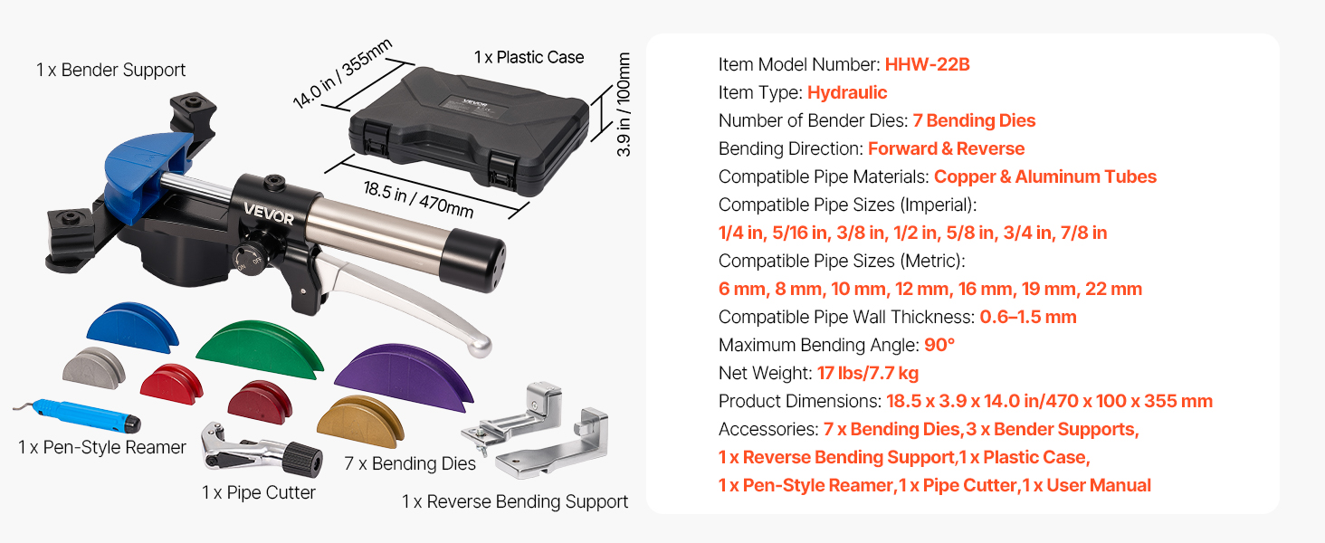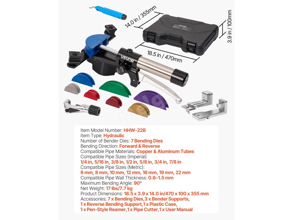 Tento ohýbač rúrok, poháňaný hydraulickým systémom, ľahko ohýba medené a hliníkové rúrky s priemerom od 1/4 do 7/8 palca (6 až 22 mm). S uhlom ohybu 0° až 90°, 7 maticami z hliníkovej zliatiny a konštrukciou umožňujúcou ohýbanie v dvoch smeroch je určený na inštaláciu systémov HVAC, opravy automobilov a priemyselnú údržbu.