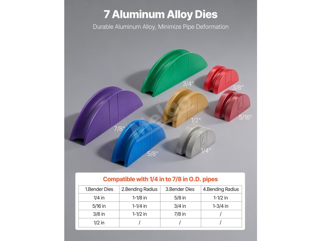 Táto ohýbačka rúrok obsahuje 7 jasne označených ohýbacích matíc, vďaka čomu je výber veľkosti rýchly a presný. Zvýšte produktivitu a konzistentnosť pri každom ohybe.